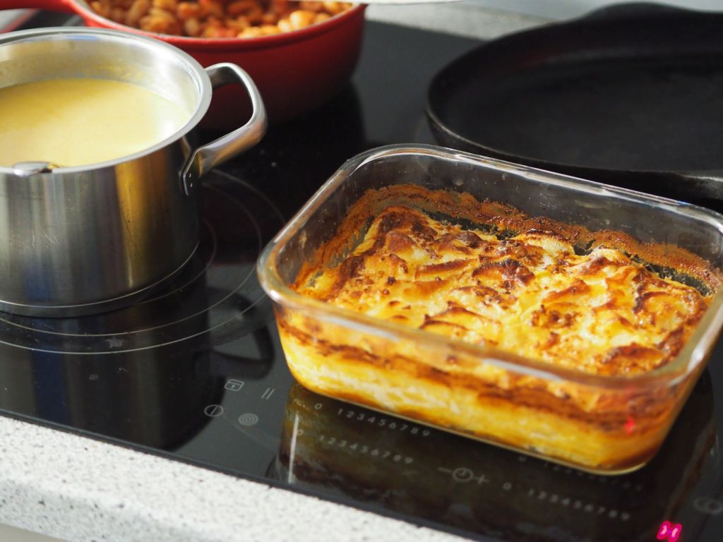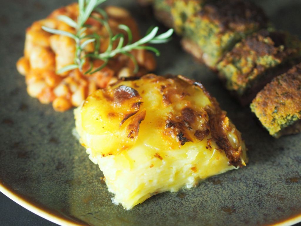 Kartoffelgratin. In dem Topf links ist die Gemüsesuppe, die nicht hier beschrieben ist.