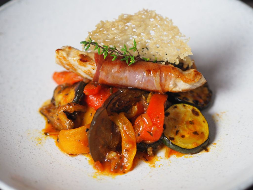 Mit Prosciutto ummantelter Hasenrücken mit Ratatouille