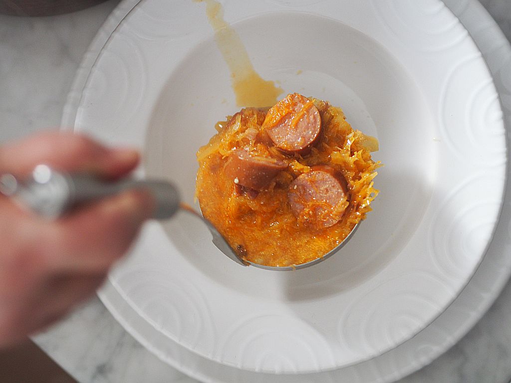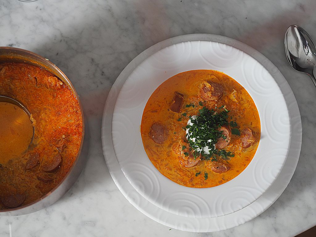 Als zweite Vorspeis gab es Kürbissuppe mit geheimnisvollen chinesischen Schriftzeichen aus Kürbiskernöl.