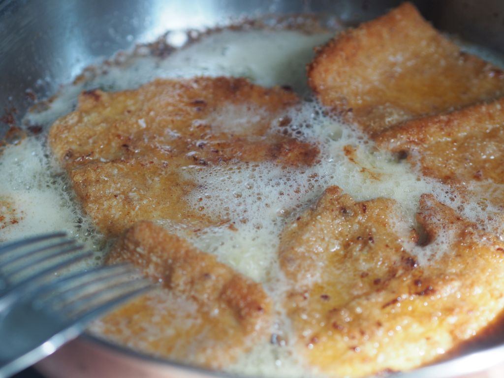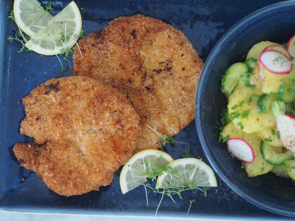 Schnitzel auf gesund umgestrickt, eins zwei drei verkehrt! Die Panier: aus Dinkelbrösel und Kokosraspel, es gibt Leinöl im Salat und Radieschen.