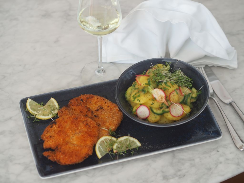 Das schmeckt! Man kann das essen und es schmeckt uneingeschränkt! Die Kokosraspel schmecken nicht störend, in der Summe ein gelungenes Schnitzel, mit knuspriger Panier, das Putenfleisch schmeckt fast so wie Kalbfleisch, von der Konsistenz und Geschmack sehr ähnlich. Der Salat: wonnig knackend mit den Radieschen, die Kartoffel: sämig, schmelzend. Ein Gedicht. Was wäre ein Sonntag ohne Schnitzel.
