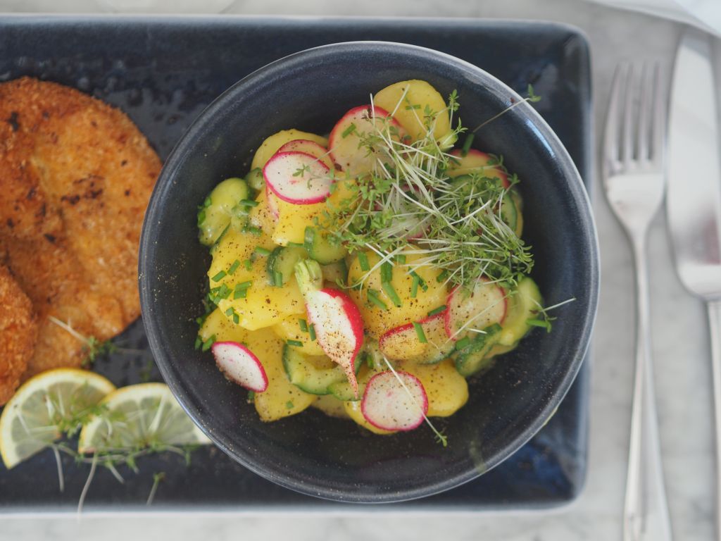 R e z e p t 4 große festkochende Erdäpfel in der Schale in kochendem Salzkümmelwasser durchgaren. In der Zwischenzeit eine Minisalatgurke halbieren und entkernen, in Scheiben schneiden. Radieschen ebenfalls in Scheiben schneiden und in eiskaltes Wasser legen bis zum Servieren. M a r i n a d e 15 ml Leinöl mit 50 ml Weißweinessig, 1TL mit Dijonsenf, 120 ml heiße Gemüsebrühe, Salz und Pfeffer gut zusammenrühren. Die noch heißen Erdäpfel schälen und in Scheiben schneiden. In die Marinade geben. Gut durchmischen, rühren damit es sämig wird und die Marinade gut einziehen kann. Gurke dazu geben und durchrühren. Auskühlen lassen. S c h n i t z e l die dünn geschnittenen Putenschnitzel salzen. Die Panierstation vorbereiten: 1. Teller: Dinkelmehl, 2. Teller: Ei mit Currypulver, 3. Teller: Dinkelbrösel mit Kokosraspel. Die Putenschnitzel durch die drei Stationen ziehen. Eine Rapsöl-Kokosmehl-Mischung in einer Bratpfanne erhitzen. Und die Schnitzel goldbraun herausbacken. A n r i c h t e n Radieschen aus dem eiskalten Wasser abgießen und unter die Erdäpfel mischen. Erdäpfelsalat mit Schnittlauch und Kresse bestreuen. Die frisch gebackenen Schnitzel sofort servieren.
