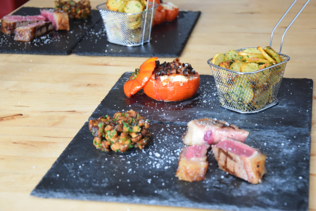 T-Bone-Steak mit Goaßkäs-Tomaten, Pfifferlingen und Sarlat-Kartoffeln