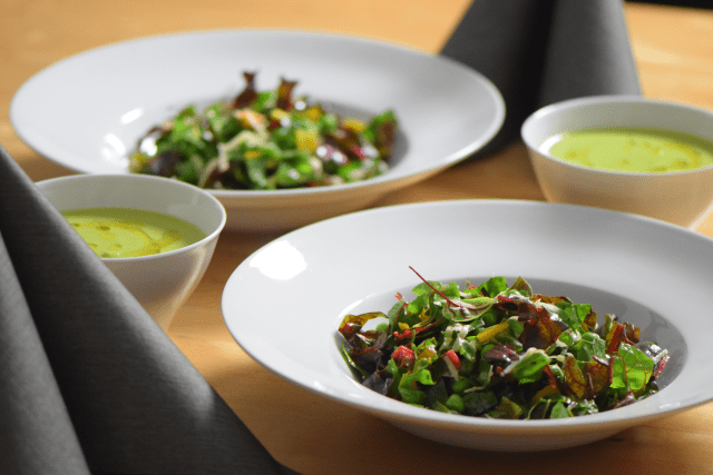 Die Suppe hat, auch wenn sie kalt ist, den vollen Geschmack nach Erbsen. Dazu kommt ein Salat aus Mangold, Bergkäse und Bergbohnenkraut als Suppeneinlage.