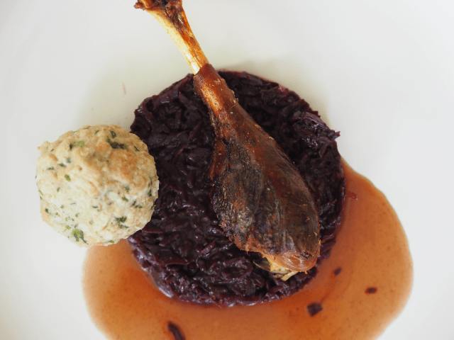 Am nächsten Tag: Salzwasser aufkochen, zurückdrehen und die Haferknödeln hineingleiten lassen und dann nur mehr ziehen lassen, nicht kochen, sonst fallen sie auseinander. In einem Topf eine helle Einbrenn machen mit Butter und Mehl. Die Suppe dazugießen, aufkochen, Schlagobers dazu und kurz köcheln lassen. In der Zwischenzeit die Ganslleber stückeln und in Gänseschmalz anbraten. Die Suppe mit den Haferknödeln, der Gänseleber und den Karotten anrichten, und mit ein bisserl Thymian bestreuen,