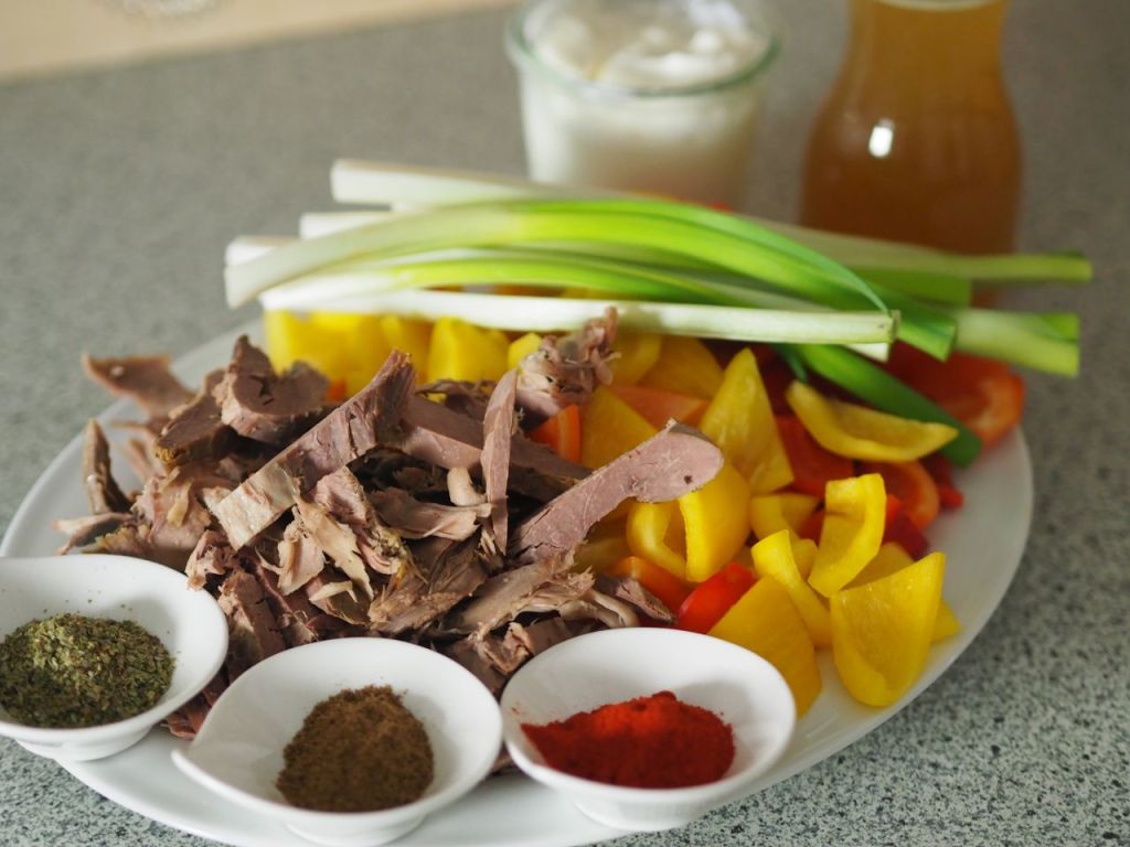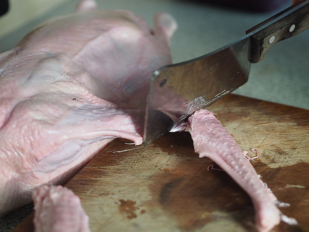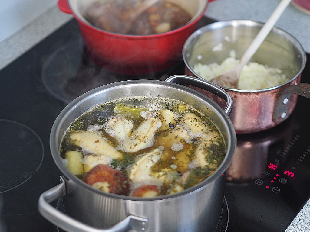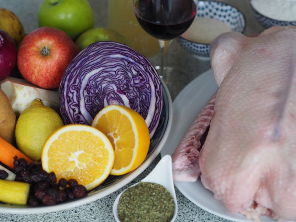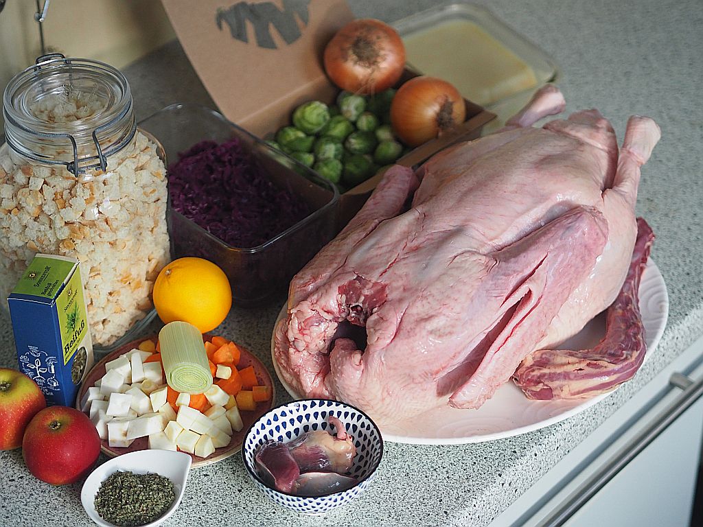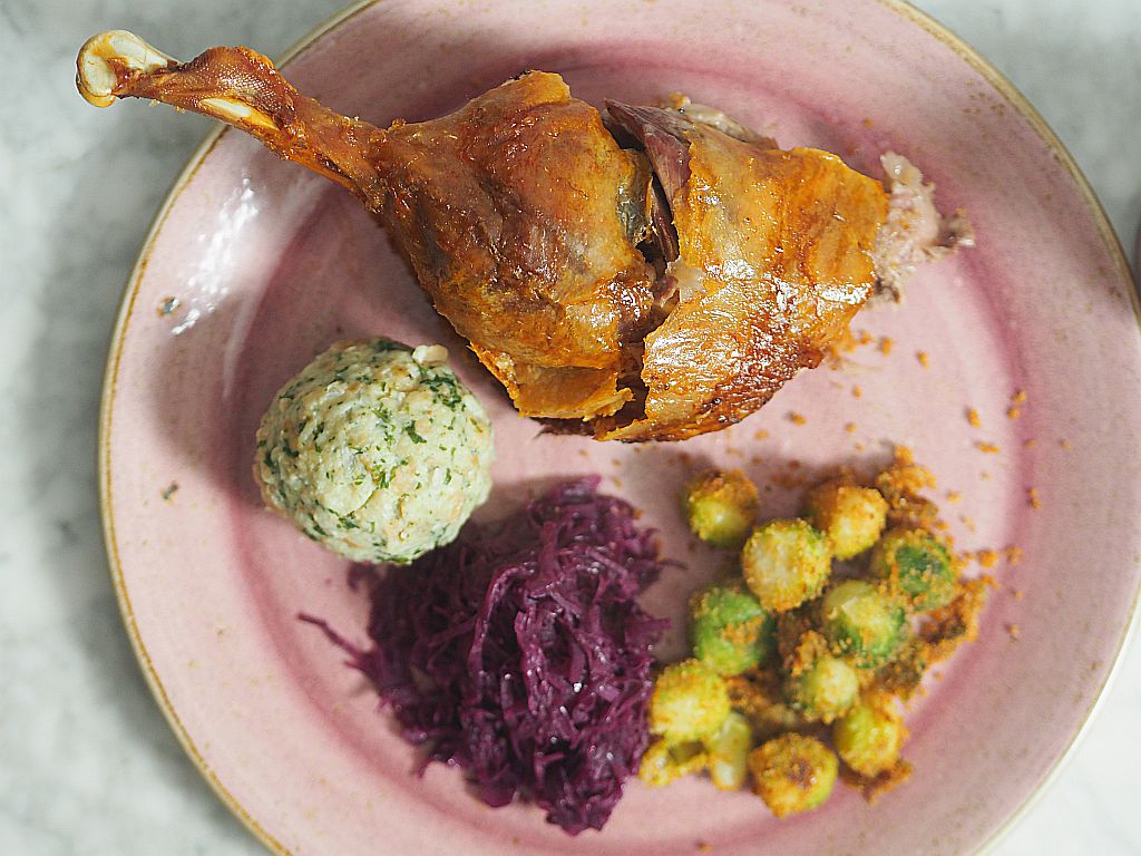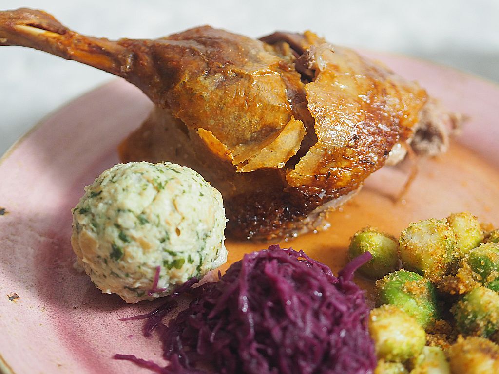 Am Vorabend: Flügerl und Hals von der Gans trennen, mit den Innereien – mit dem Magen und Herz – mit Suppengrün, Lorbeerblatt, Koriander, Wacholderbeeren, Beifuß, Thymian, Tomate und einer halbierten angerösteten Zwiebel eine Suppe aufsetzen. Drei Stunden köcheln lassen. Die Haferknödel: Hafer in einer Pfanne leicht anrösten. Schlagobers dazu und vom Herd nehmen. Salz, Pfeffer, Muskatnuß dazugeben, gut durchrühren und ziehen lassen. Wenn es ausgekühlt ist, ein Ei einrühren, ein bisserl ziehen lassen und kleine Knöderln formen. Mit Frischhaltefolie abdecken und im Kühlschrank über Nacht aufbewahren.