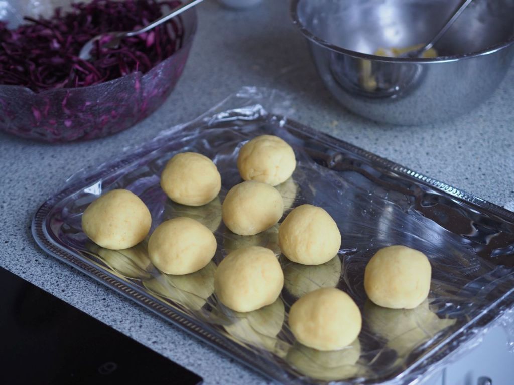 Am Vorabend: Ein ½ kg Erdäpfeln in der Schale weichkochen. Ausdampfeln lassen, schälen und durch die Kartoffelpresse drücken. Ein Ei, Salz, Muskatnuß und erst mal 2 EL Flohsamenschalen dazu geben und gut durchkneten, ziehen lassen. Und wenn noch der Teig zu weich ist fürs Ausrollen, mehr Flohsamenschalen dazu geben. Butterkürbis in dünne Scheiben schneiden, auf ein Backblech legen, und im Backrohr bei 180°C durchgaren. Auskühlen lassen. Den Kartoffelteig auf einer Frischhaltefolie ausrollen, etwa 1 cm dick. Die ausgekühlten Kürbisstücke darauf legen, und etwas salzen, mit Hilfe der Frischhaltefolie zu einer Rolle drehen. Und einwickeln. Im Kühlschrank übernachten lassen.