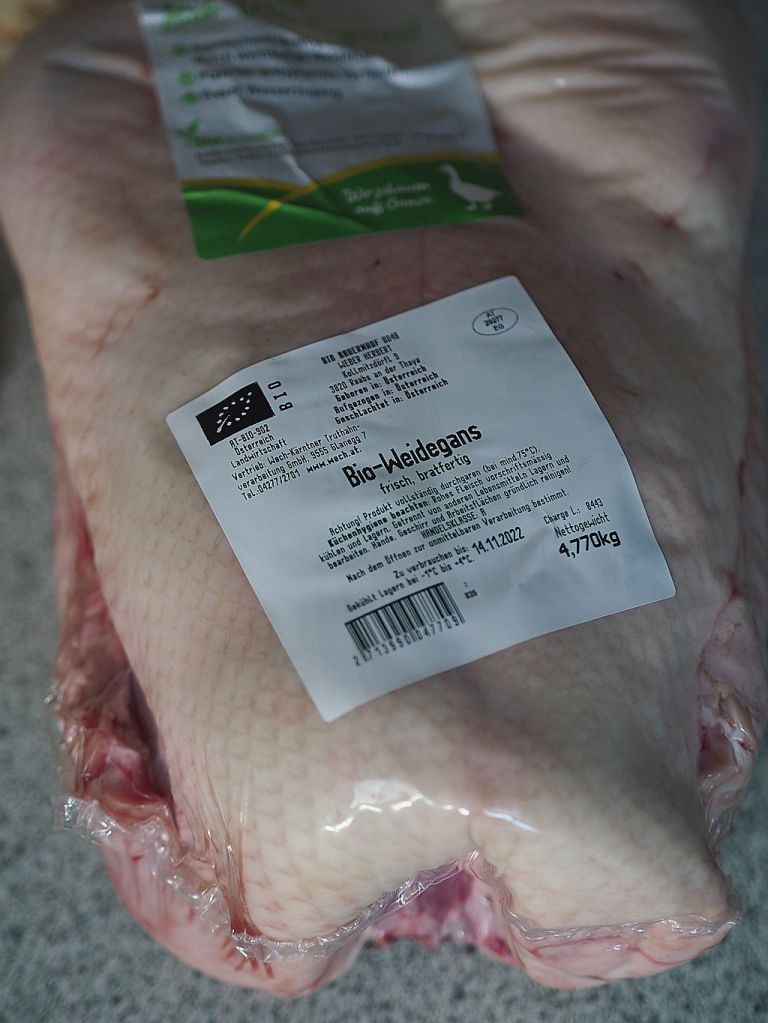 Dazu gab es Naturweine aus dem Weinviertel: zuerst einen Weißen, um die Bratzeit vom Gansl zu überbrücken, eine Cuvee aus Zinfandel und Grünen Veltliner, Hopibauern, The Goat, 2023; – golden im Glas, passend zum Herbst. Dann zum Gansl eine Cuvee aus Cabernet Sauvignon und Zweigelt, Hopibauern, The Dog, 2023. Im Weingarten wurde mit der Hand und mit Pferden gearbeitet; die Trauben wurden mit den Füßen gestampft. Statt in Glasflaschen wurde der Wein in Tonflaschen gefüllt. Das kommt nicht in den Glascontainer, bittesehr.