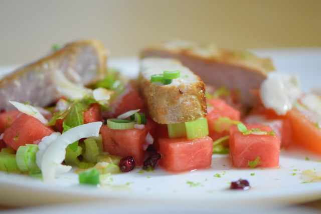 Schnitten von gebratenem Schweinskarree mit Wassermelone, Grapefruit und Berberitzen. Darüber ein warmes Kokos-Sahne-Dressing geträufelt, leicht angeröstete Kokos-Chips dazu und wir haben einen echten Muntermacher.