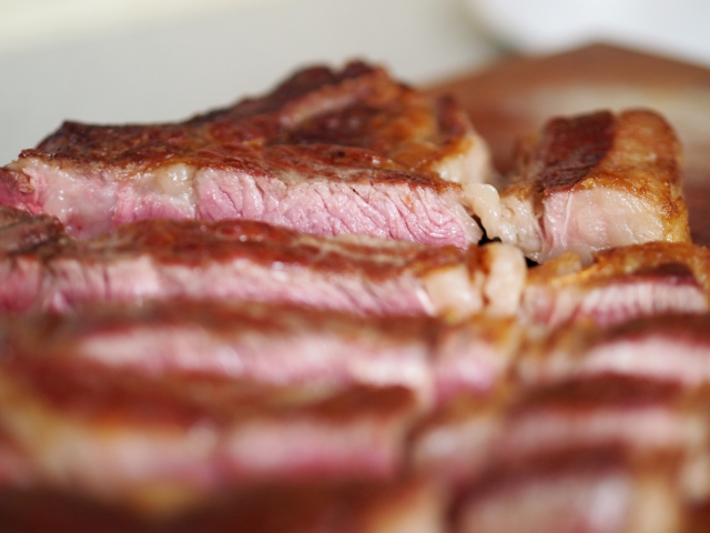 Das Steak, 35 Tage gereift, hat eine schöne Maserung und kommt ganz aus der Nähe: aus Weiten im südlichen Waldviertel, Bezirk Melk. Das Gemüse stammt vom Feigenhof/Wien, selbst die Melone und sogar die getrockneten scharfen Chilis.