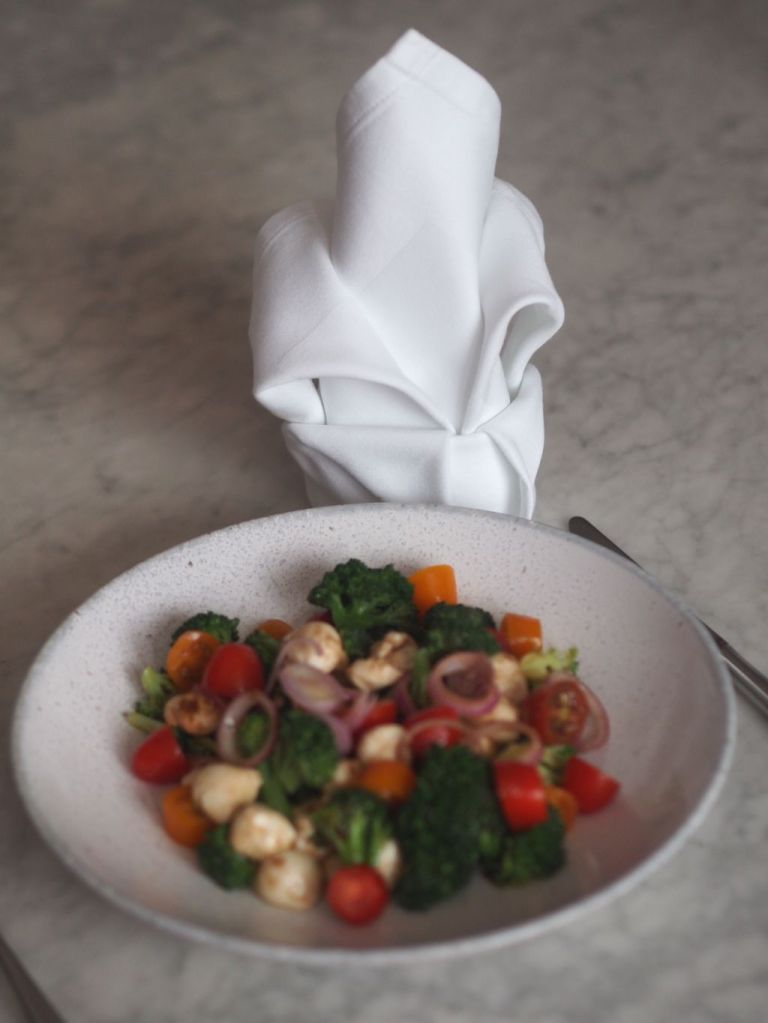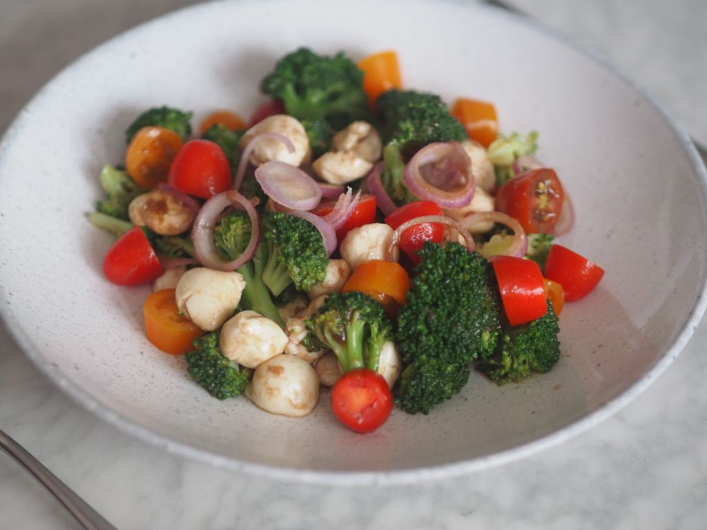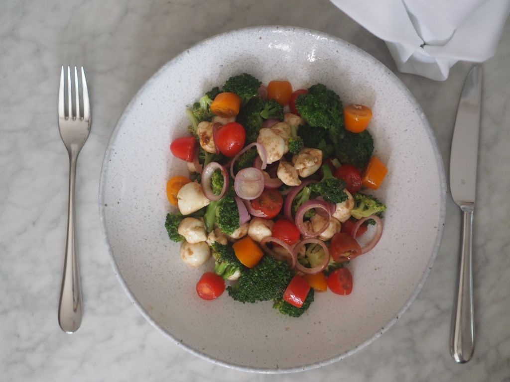 Und Brokkoli, Tomaten, Friséesalat und Stangensellerie. Die Senfmarinade hält alles zusammen. Wir haben einen mittelscharfen Senf genommen, ohne Zucker. So ein Senf ist schwer zu finden. Irgendwie ist man der Meinung, ohne Zucker nicht auszukommen, sogar im Senf hat er sich versteckt.