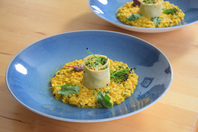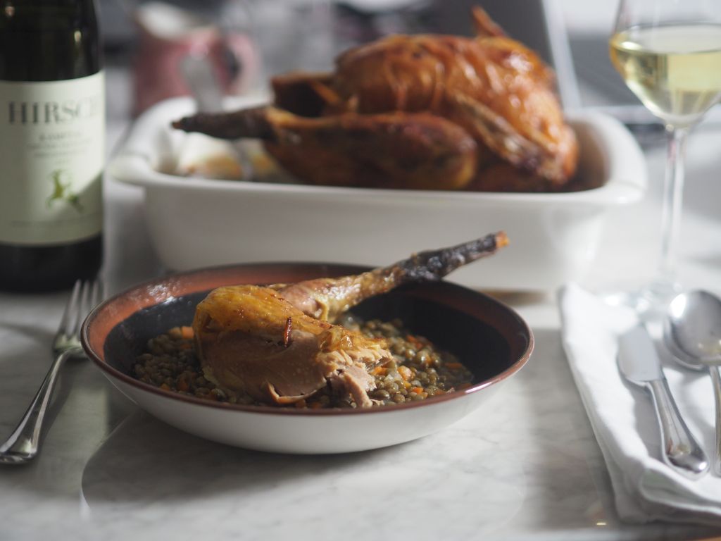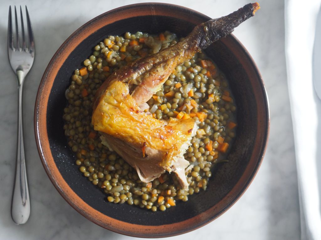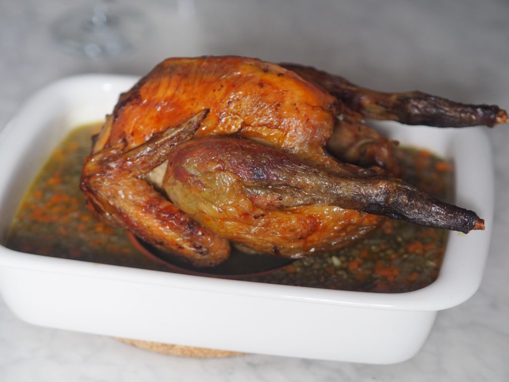 Die Linsen werden am Vortag eingeweicht. Das küchenfertige Perlhuhn wird mit Knoblauch und Thymian gefüllt und bei 220° im Backrohr mit Butter und Olivenöl gebraten. Den Bratensatz mit Geflügelfond ablöschen, einköcheln lassen. Linsen Gewürfelte Karotten und Zwiebeln in Olivenöl anschwitzen und die Linsen dazugeben. Mit Geflügelfond bedecken. Ein Bouquet garni dazufügen. Und bei mittlerer Hitze kochen. Den Bratenjus dazufügen.
