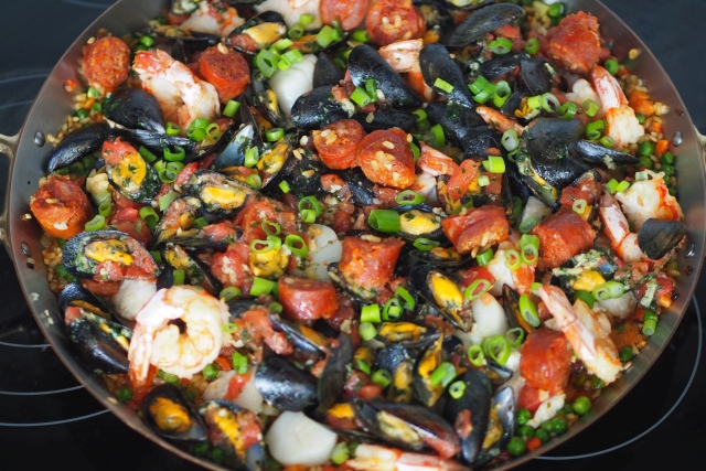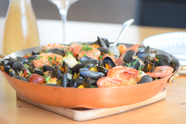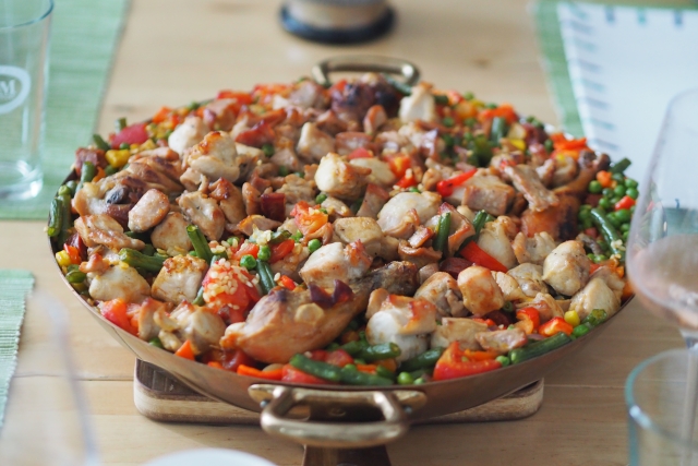 Andalusien war ja das Armenhaus Spaniens, das heißt das Hinterland der Costa del Sol, um Valencia ; – – und von der kommt ja die Paella Andaluz her, die Paella für Arme; – also nicht mit Garnelen und Co. Stattdessen Hasen- und Hühnerfleisch. Was halt so kreucht und fleucht auf einem Bauernhof. Hasenstall hab ich noch als Kind erlebt, am Hof herumlaufende Hühner auch. Bei uns ist es mindestens so heiß wie in Andalusien und deshalb gibt es bei uns genau das, nach einem Rezept im „Grand Livre de Cuisine“ nur ohne Safran; – kann ich mir nicht vorstellen, daß das teuerste Gewürz dem andalusischen Kleinbauern zur Verfügung stand. Das heißt, Moment, doch! Safran wird in Andalusien seit langem angebaut.