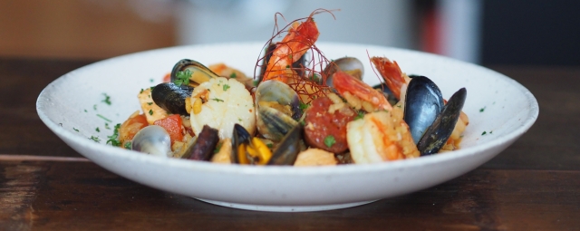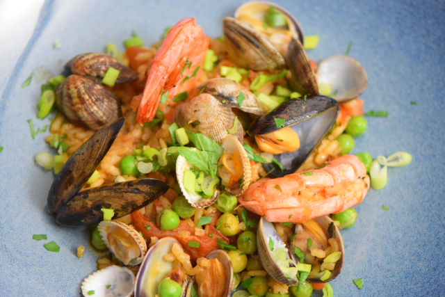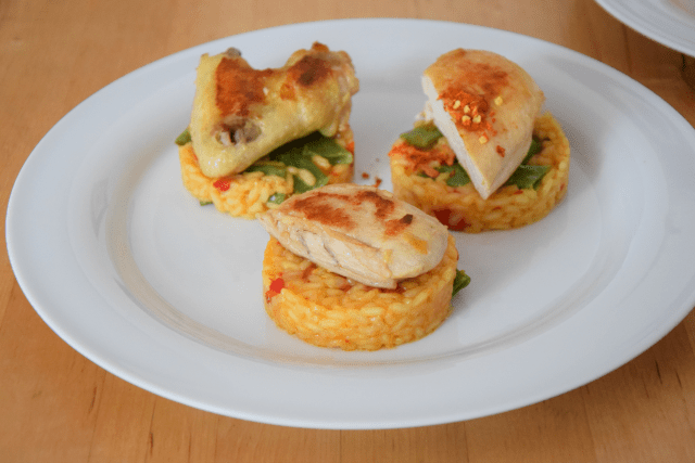 Einen Hasen filetieren. In der Paella-Pfanne 1 EL Olivenöl erhitzen. Eine Hühnerbrust, einen Flügel, die 2 Stränge Hasenrücken und die ausgelösten Hasenschenkel salzen. In der Paella-Panne rundum scharf anbraten. In eine feuerfeste Form legen und bei 140°C im Backrohr fertiggaren. Achtung, daß das Fleisch nicht austrocknet. In die Paella-Panne mit dem Bratensatz 1 EL Olivenöl geben. 200 g Paella-Reis dazugeben. Kurz anrösten. Mit ½ L Hühnerbrühe aufgießen. Dabei löst sich der Bratensatz. 16 Safranfäden, 6 mittelgroße, enthäutete, entkernte und geviertelte Tomaten dazugeben, auf starker Hitze köcheln, nach 10 Min. 250 g Fisolen hineingeben. Etwas Flüssigkeit dazugeben. Fertiggaren. Zurückdrehen. Mit Salz abschmecken und ziehen lassen.