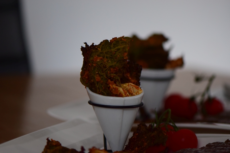 Der Grünkohl wird zerzupft und mit einer Tomaten-Knoblauch-Paste vermischt und im Backrohr getrocknet. Dazu ein Steak aus der Grillpfanne auf der Fettkante gebraten.