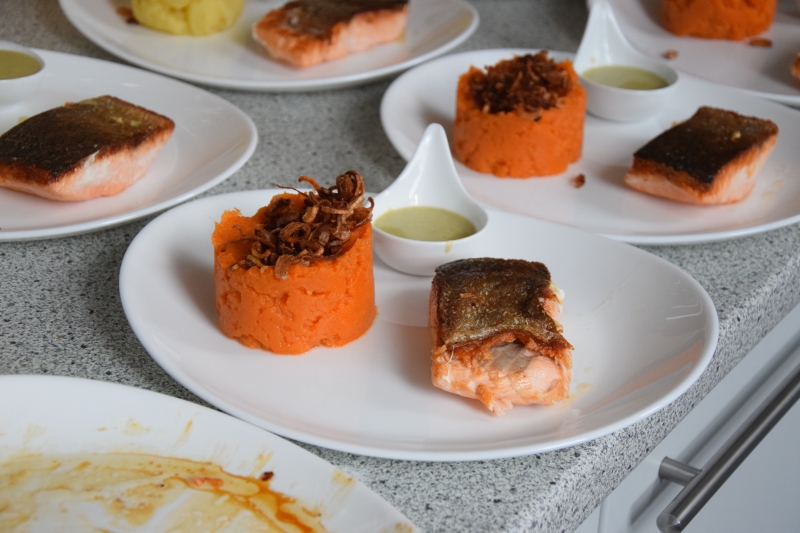 Für die Kokossauce wurden Chili, Limetten, Zitronengras, Koriander u.a. püriert. Das Kartoffelpüree wurde drei Mal aus Süßkartoffeln und drei Mal aus Ofenkartoffeln gemacht. Der Lachs wurde gebraten. Dazu geröstete Schalotten.