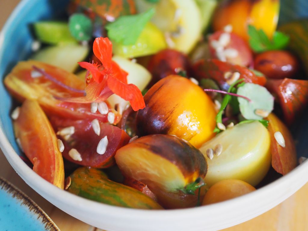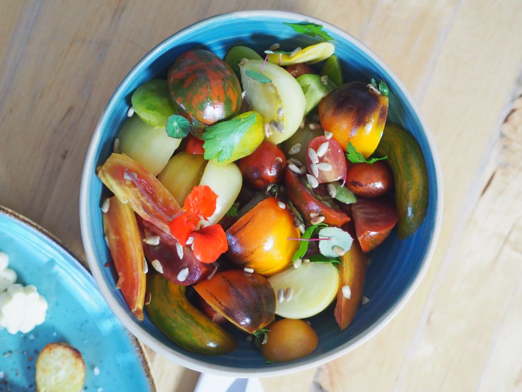 Oder: Kalottenbestücktes Huhn mit Paradeiservielfalt. Ein fantastisches Essen mit der Diversität aus dem Tomatenuniversum.