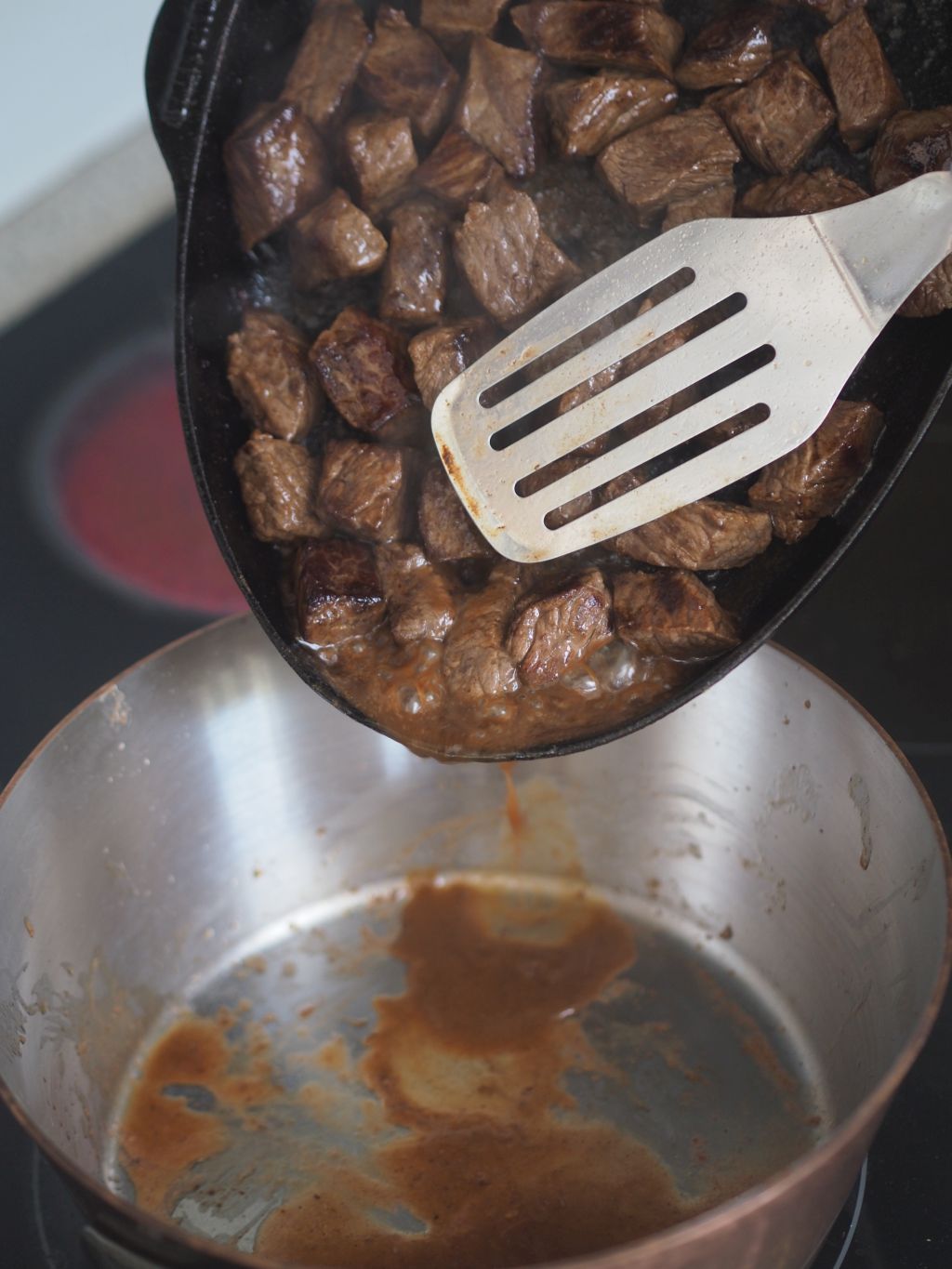 Beim Anbraten der Fleischstücke wird der dabei entstehende Saft nicht verdampft, sondern in eine Sauteuse abgegossen und weiterverwendet.