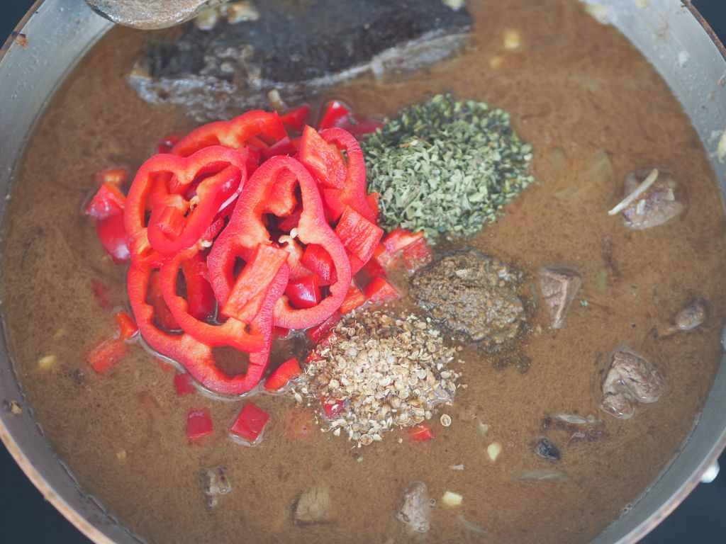 Mit Rindssuppe soviel aufgießen, sodaß alles bedeckt ist.