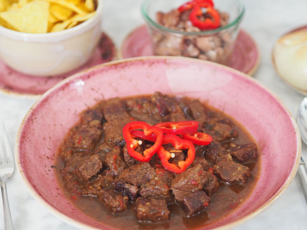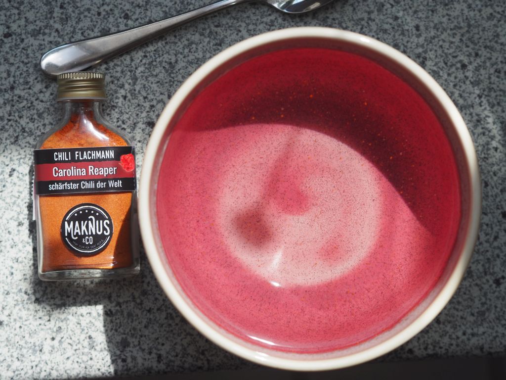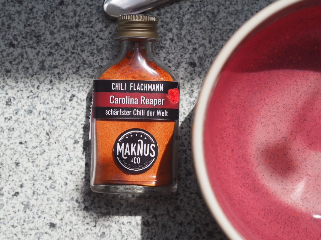 Im Rezept, siehe unten, an dem wir uns orientiert haben, kommt kein Chilipulver vor, da kommt eine ganze Chili hinein und nicht Carolina Reaper. Deshalb – Stichwort „Texturmix“ – kam bei uns eine Spitzpaprika dazu.