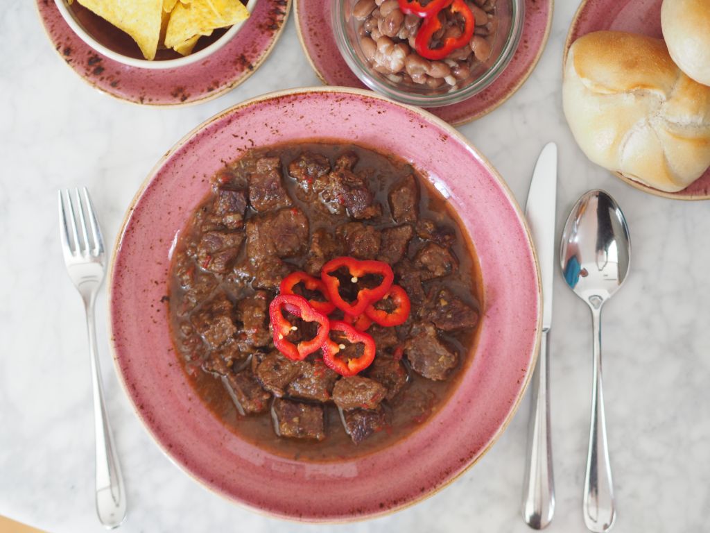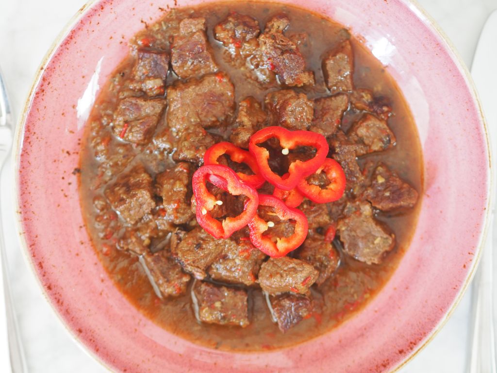 Herd zurückdrehen. Zugedeckt etwa 1,5 Stunden schmoren. Ein zwei Mal die Schärfe nachjustieren.