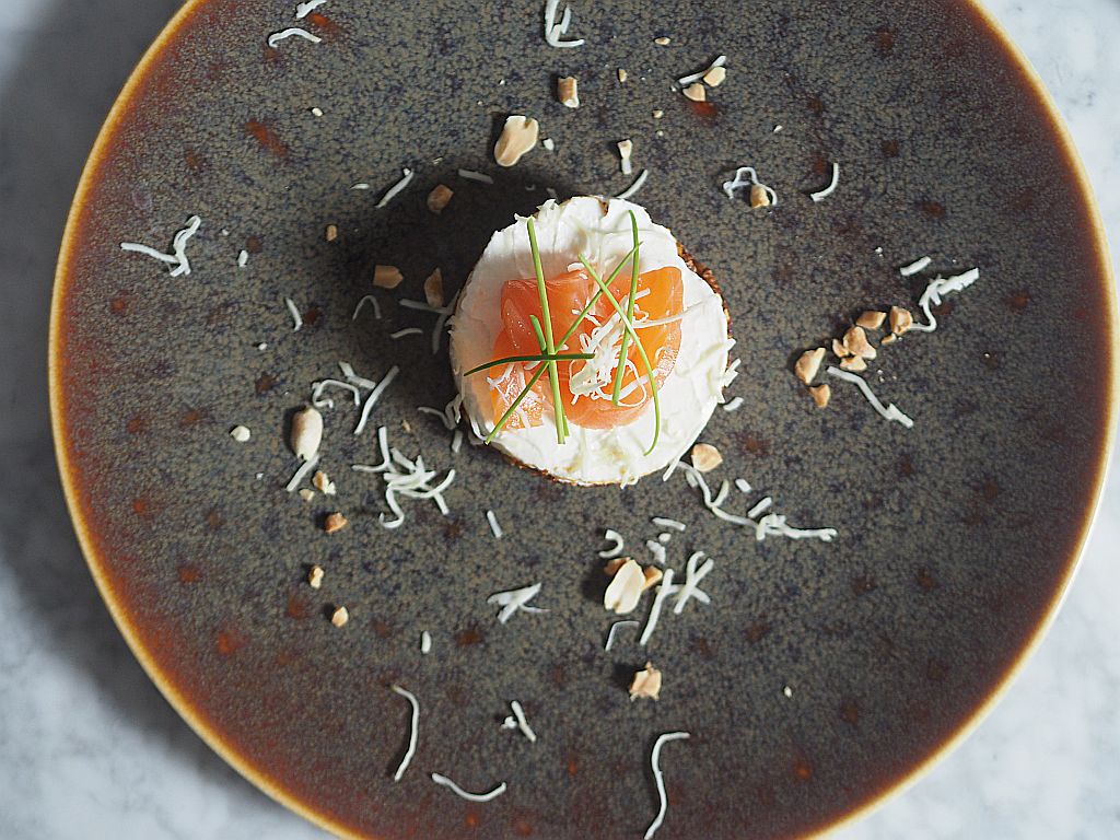 Nach Anne Flecks Buch „Die 70 einfachsten Gesund-Rezepte“, Räucherlachs mit Meerrettich auf Erdnüssen, S. 179
