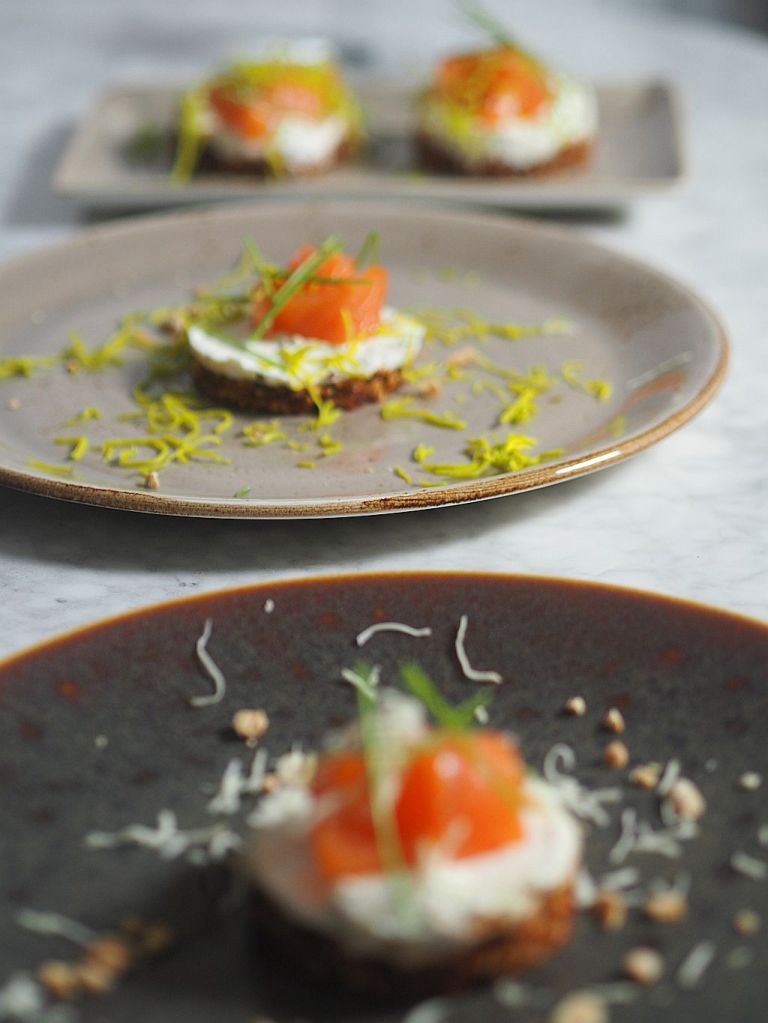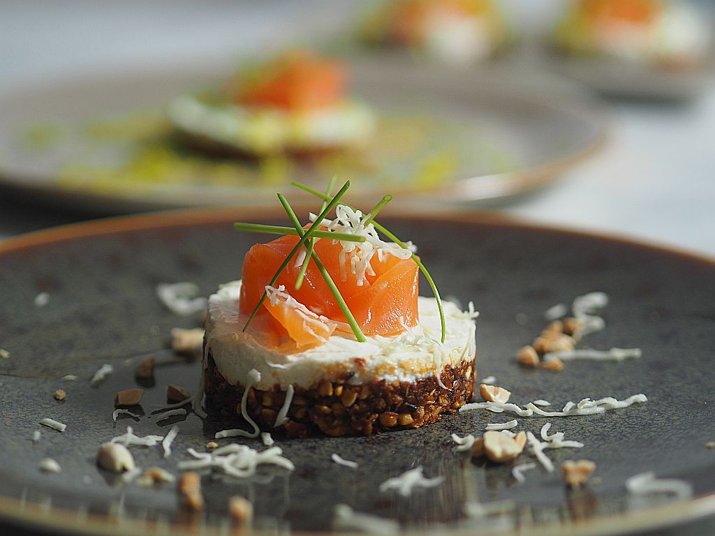 Lachs-Partybrötchen kennt man als getoastetes Weißbrot, mit Butter bestrichen, darauf wird eine Scheibe Räucherlachs gelegt, gerissener Kren kann darauf kommen oder ein gekochtes Ei. Aber das geht auch anders, gesünder! Bei der hier vorgestellten Variante steht immer noch der Räucherlachs im Mittelpunkt, aber statt dem Weißbrot kommt eine Haselnuß-Tomaten-Mischung als Boden zum Einsatz; und statt Butter gibt es Frischkäse, mit Kren vermischt. Aber sonst ist alles gleich…