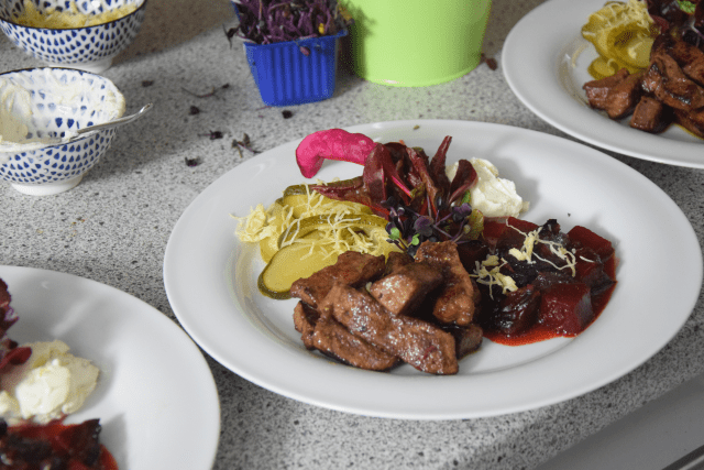 Zerzupftes Schweinefleisch mit Kraut und Zwiebeln in Wirsingblätter gehüllt, dazu ein Püree aus einer Mischung aus Pastinaken, Sellerie und Petersilienwurzel. Es geht auch ohne Kartoffelpüree.