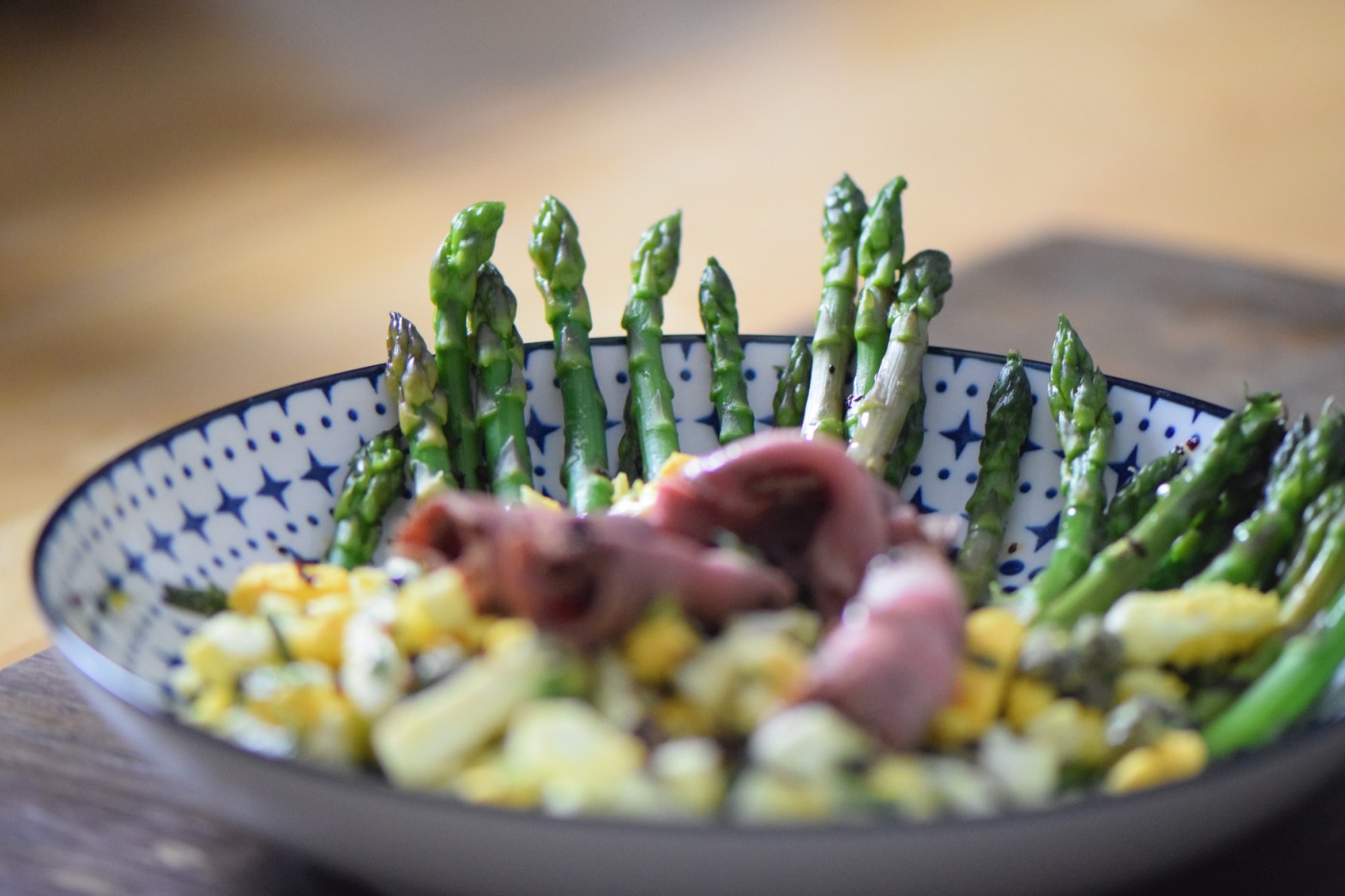 Um diese Jahreszeit gibt es Spargel nur aus Peru. Aber das Rezept war so verlockend. Spargelsalat mit Kräutervinaigrette und gehacktem Ei. Mit den feinen Laura-Kartoffeln und den wohlschmeckenden Linzern von Stekovics. Und mit den Kräutern Dille, Petersilie und Kerbel sowie mit den Micro Greens Radieschen, Pak Choi, Boretsch und Kapuzinerkresse. Rauchiges Barbecue-Olivenöl kam in die Vinaigrette hinein. Dabei mußten wir mit Bedauern zur Kenntnis nehmen, daß wir neuen Senf brauchen. Aber woher guten Senf nehmen, dabei wüßten wir schon, woher, aus dem Mühlviertel, dort gibt es eine Familie die die Senfsaat selbst erntet und verarbeitet so wie wir das wollen. Doch leider sind die Gebinde entweder zu klein 110 ml oder zu groß 1 kg.