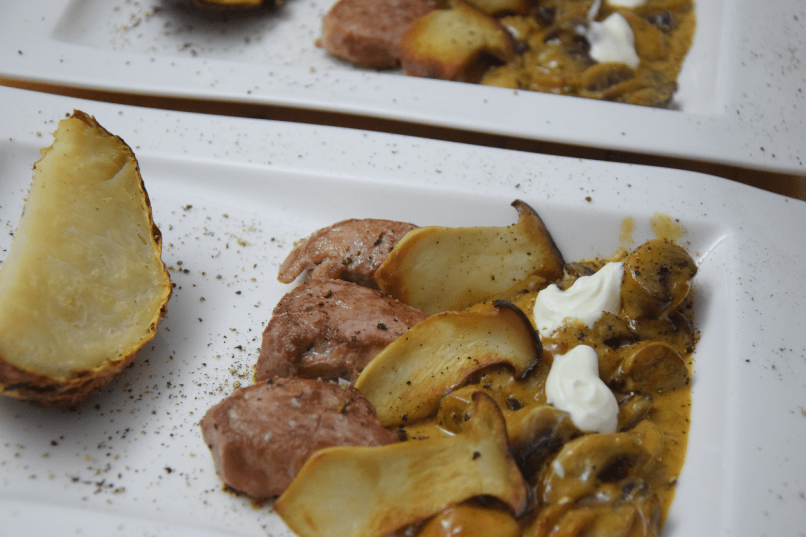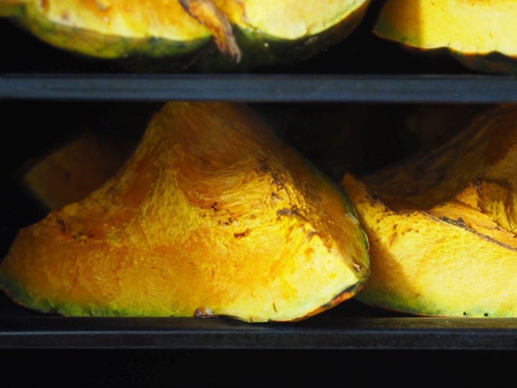 Der Kürbis wurde im Backrohr aufgeweicht, sodaß man ihn besser schälen kann.