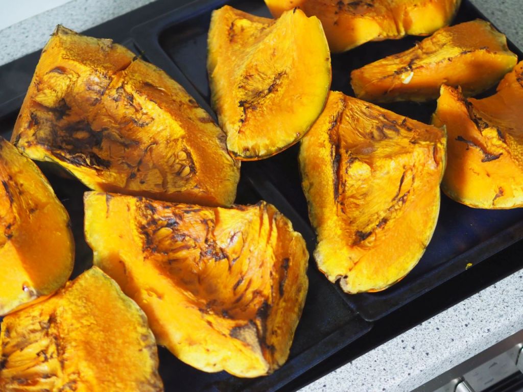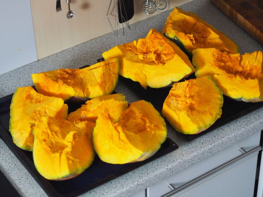 Die zerlegten Kürbisteile bevor sie ins Backrohr kamen.