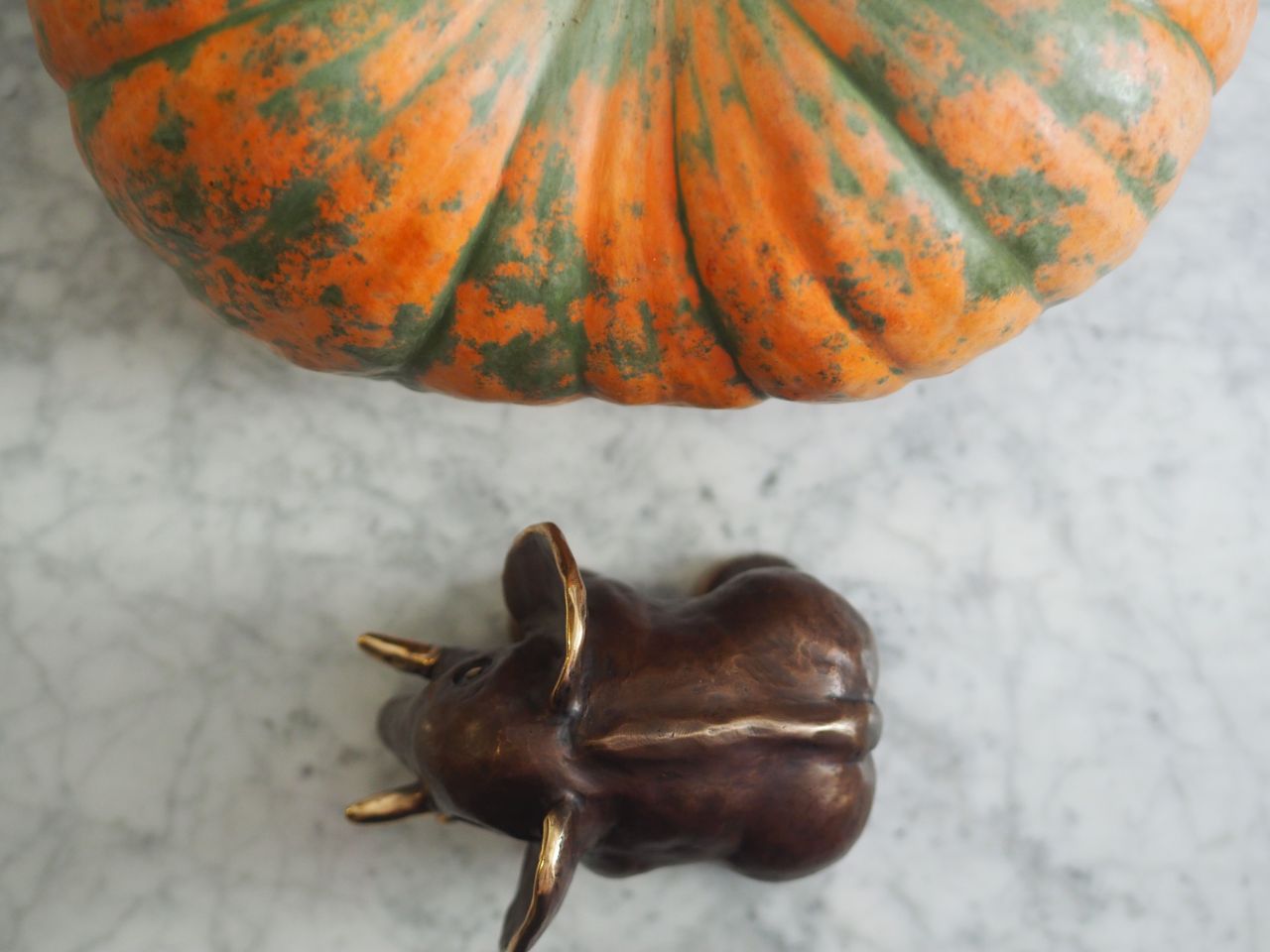 Wir haben einen ziemlich großen Kürbis zu verarbeiten, das heißt einen wirklich großen! Zum Größenvergleich haben wir einen Elefanten daneben gestellt. Ja der Kürbis ist wirklich groß! Ankündigung: wir planen eine große Jamie-Oliver-Kürbiswoche. Der Kürbis wurde aufgeschnitten und im Backrohr aufgeweicht, sodaß man ihn leichter schälen kann. Die Rezepte von Jamie Oliver wurden bereits ausgesucht!