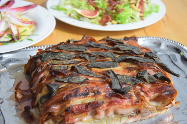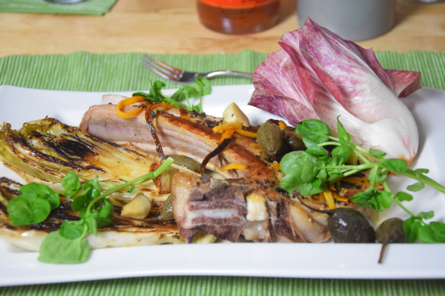 Eine Topinambursuppe mit Pinienkernen und Koriander als Vorspeise. Danach ein gebratenes Kalbkotelett, das mit einem Salat aus gebratenem Chicorée, Kapernbeeren und Knoblauch in einer Orangen-Kapern-Butter serviert wird.