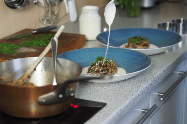 Nach einem Rezept aus Dr. med. Anne Fleck, Gesünder geht`s kaum, S.102 „Kürbisbulgur mit Austernpilzen, Rucola und Mandel-Knoblauchdressing“ von Bettina Matthaei. Bei ihr gab es Lammfleisch, was uns jetzt nicht so zusagt. Und Austernpilze, aber da hätten wir nochmal losfahren müssen.