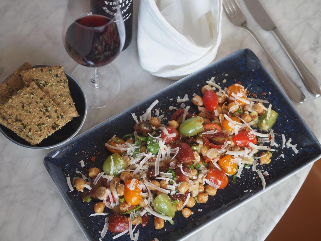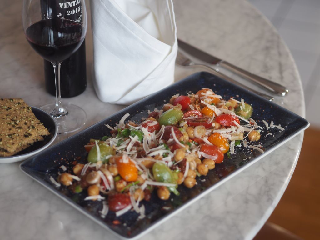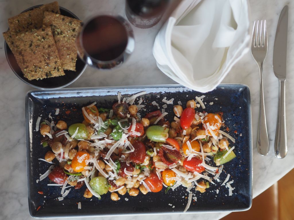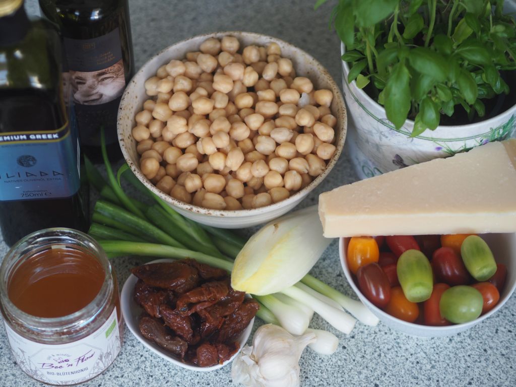 400 g Kichererbsen aus dem Glas abgießen, mit kaltem Wasser abspülen und abtropfen lassen. 200 g Kirschtomaten halbieren, 6 getrocknete Tomaten kleinwürfeln, 3 Frühlingszwiebeln in Scheiben schneiden. Den Chicorée ebenso in Scheiben schneiden. Etwa 50 g Parmesan grob reiben. Marinade 2 EL Olivenöl, 1 EL Balsamicoessig, 2 geriebene Knoblauchzehen, 1 TL Honig, Salz verrühren. Das vorbereitete Gemüse vermischen, mit der Marinade reichlich beträufeln, mit gehackten Basilikumblättern und dem Parmesanabrieb bestreuen.