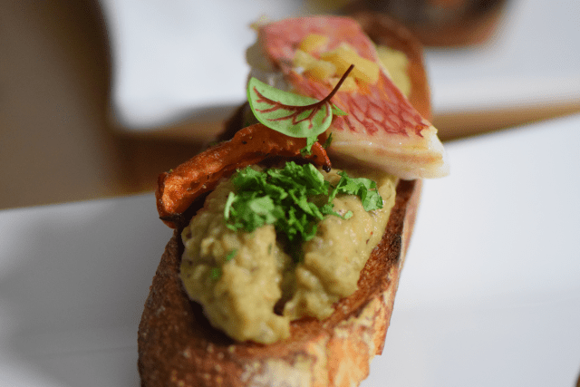 Brust vom Perlhuhn von Kräuterbutter umhüllt, mit Perlhuhnschenkel in Chicorée-Tourte.