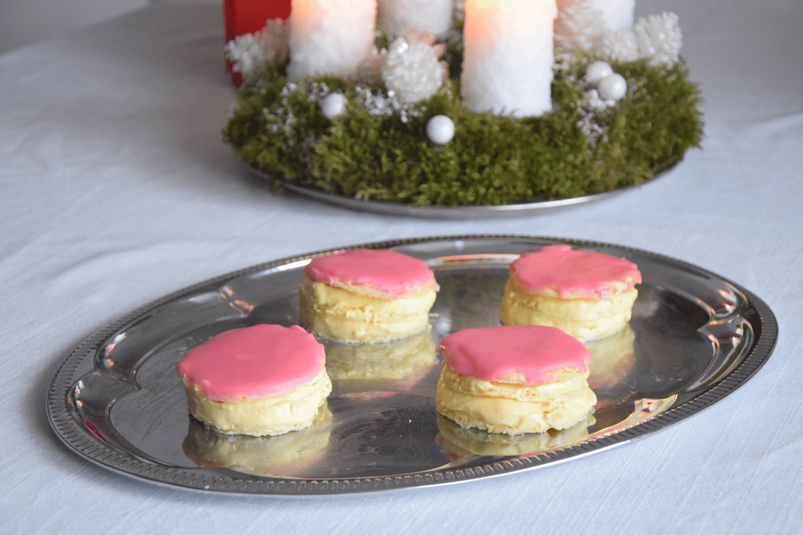 Runde Punschtörtchen aus luftigen Blätterteigschichten, dazwischen Oberscreme mit Vanille. Wir haben etwas weniger SukrinMelis (Zucker) genommen als üblich. Das wurde mit einem Schuss Grand Marnier ausgeglichen.