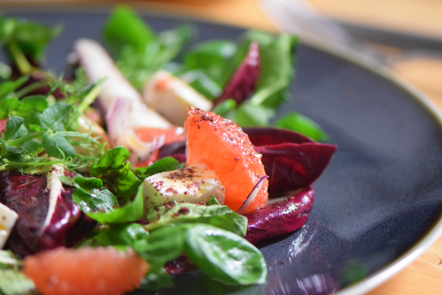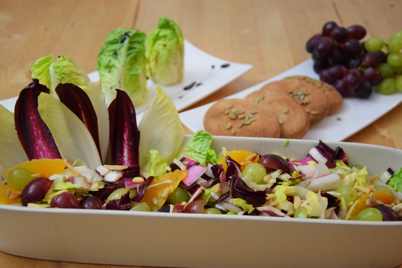Der gebratene Radicchio macht eine dezent bittere Note. Sehr apart! Nach Anne Fleck, Die 70 einfachsten Gesund-Rezepte, Blumenkohl-Parmesan-Rösti mit Meerrettich-Dip, S. 125