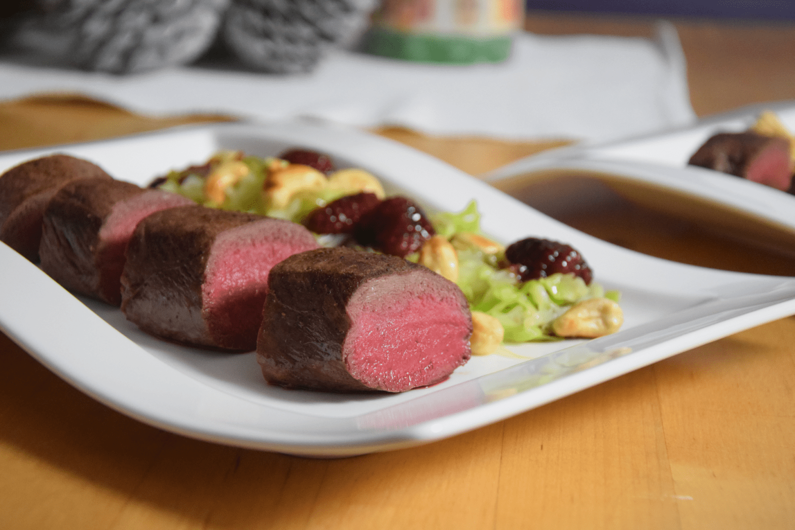 Für das Rehragout: 850 g Rehschulter, Butterschmalz, 1 EL Soffrito, Portwein, Salz, Lorbeerblatt, Wacholderbeeren, Thymian, Rosmarin, 350 g Eierschwammerl, Kartoffelschupfnudeln, Butterbrösel, ½ Rotkrauthappel, Salz, 10 Zwetschken, 1 rote Zwiebel, Gemüsebrühe, Rotweinessig