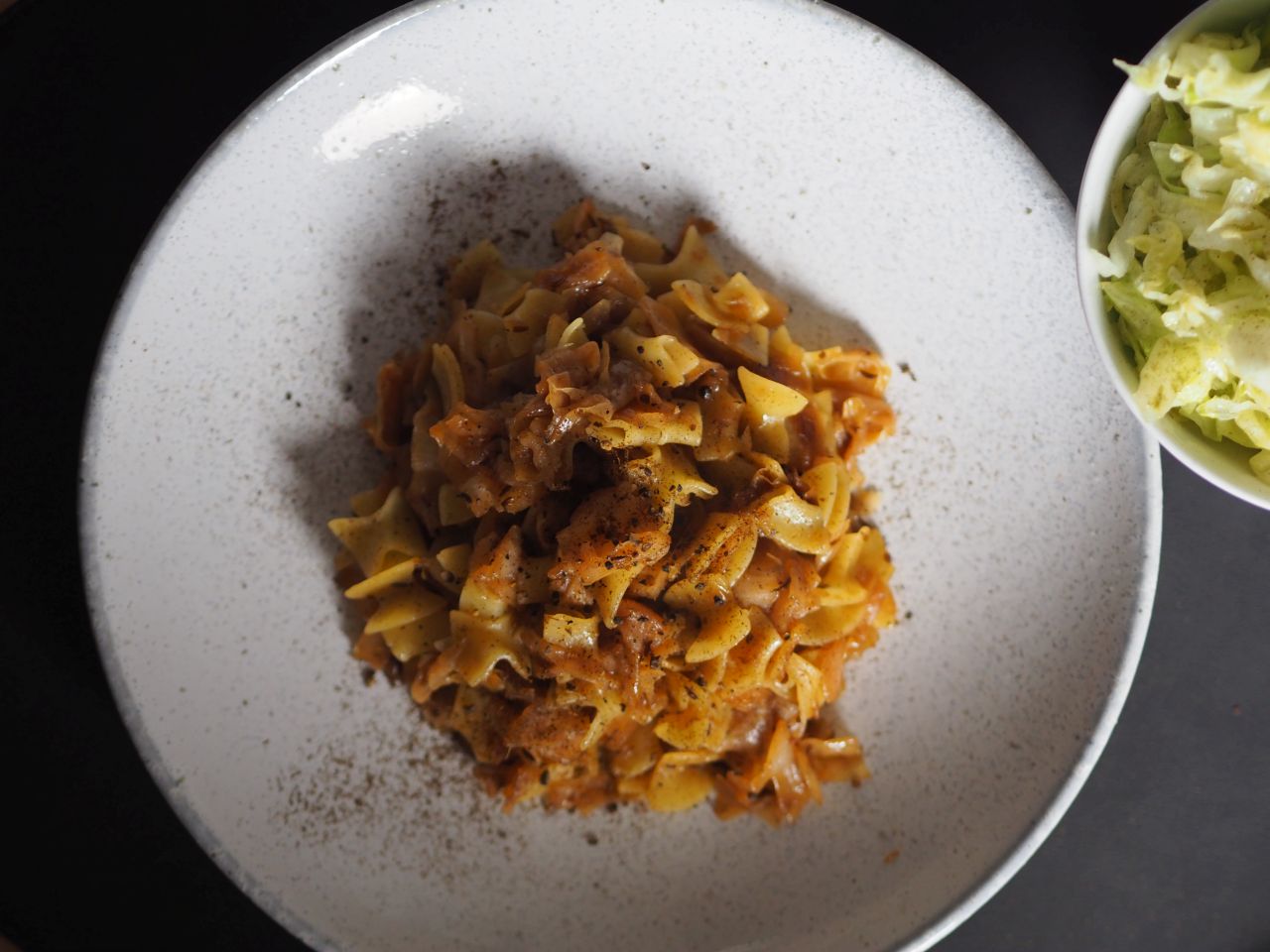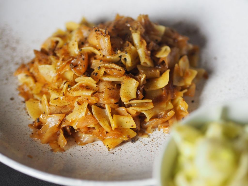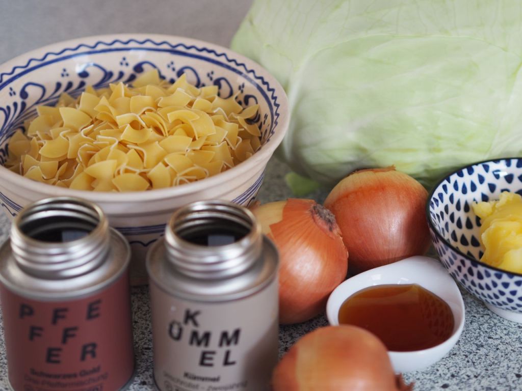 3 kleine gehackte Zwiebeln in einer Pfanne mit 4 EL Butterschmalz anschwitzen. 1 TL Honig dazu geben und karamellisieren. Das Braunschweiger Kraut halbieren, den Strunk herausschneiden, die Blätter herunternehmen, übereinanderlegen und in rautenförmige Streifen schneiden. Das Kraut in die Pfanne geben. Salz, Kümmel und Pfeffer dazu geben. Das Kraut braten, dann mit Rinderbrühe aufgießen. Zudecken und zirka eine Viertelstunde bissfest kochen. Deckel abnehmen und köcheln lassen, bis die Flüssigkeit verdampft ist. Die Fleckerl in Salzwasser kochen, abseihen und dazugeben. Mit Kümmel und Pfeffer würzen.
