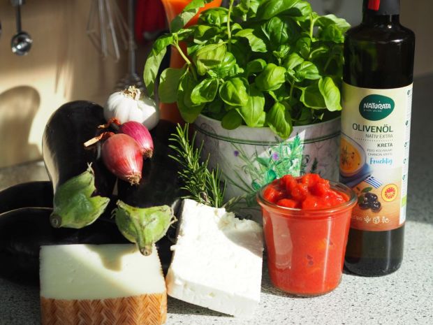Zwei fein gehackte Schalotten und drei fein gehackte Knoblauchzehen in Olivenöl anschwitzen. 400 Gramm Polpa (gestückelte Tomaten) und einen halben Liter – von der Pizza hier übrig geblieben – Tomatensauce dazu geben. Zwei Zweige Rosmarin, vier Zweige Basilikum, Salz und Pfeffer zu den Tomaten geben und eine gute Stunde leise köcheln lassen. In der Zwischenzeit Auberginen in halbe Zentimeter dicke Scheiben länglich schneiden. Auf beiden Seiten in der Pfanne in Olivenöl etwas bräunlich braten. Auf ein Blatt Küchenkrepp legen und auskühlen lassen. Jeweils ein Stück Schafkäse in ein Auberginenblatt einrollen.