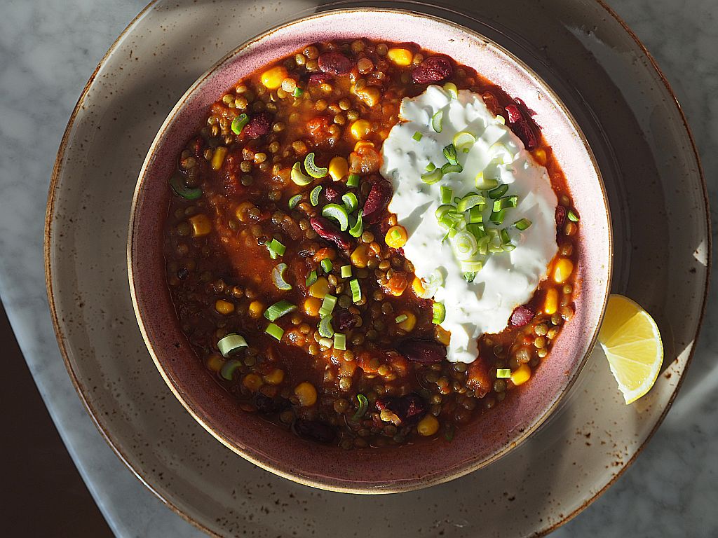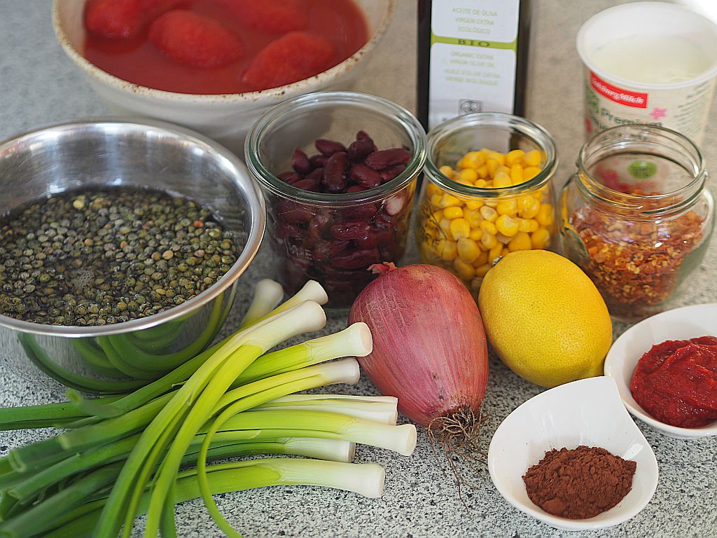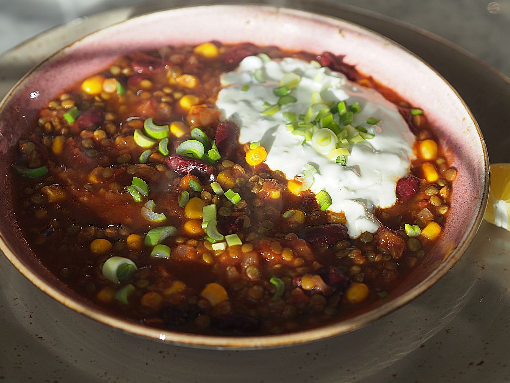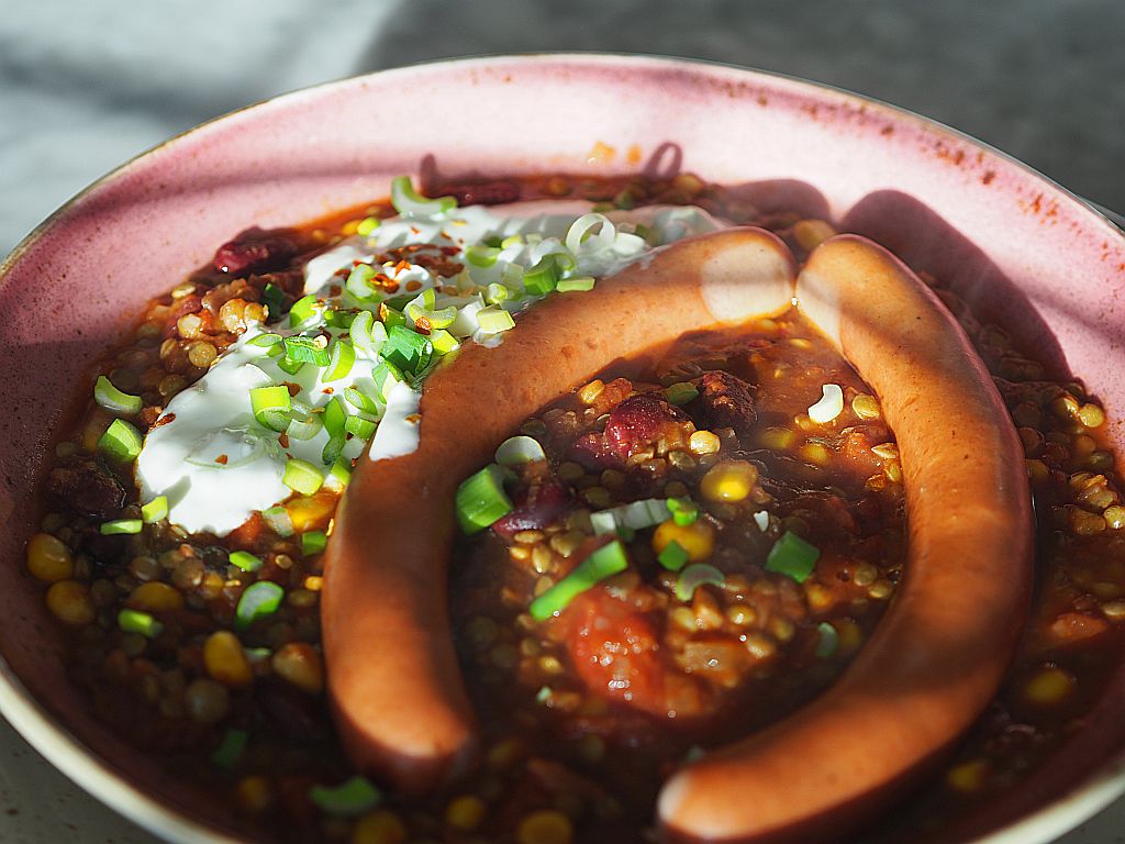 140 Gramm Puy-Linsen in Wasser einweichen. Eine Zwiebel in einem Sautoir anschwitzen. Linsen und einen Eßlöffel Tomatenmark dazu geben, umrühren. Salzen. 400 Gramm geschälte und gestückelte Tomaten (Polpa) dazu geben, sowie mit etwa einem Dreiviertelliter vom Einweichwasser aufgießen. Aufkochen, abgedeckt eine halbe Stunde köcheln lassen. Umrühren nicht vergessen. Zirka 140 Gramm Maiskörner und 200 Gramm Kidneybohnen dazu geben. Einen Teelöffel Chiliflocken, Kakao und eine geriebene Knoblauchzehe einrühren. Salzen. Fertigstellen/ Anrichten Wasser in einer Kasserolle aufsetzen, aufkochen. Vom Herd ziehen und Frankfurter Würsteln einlegen und zehn Minuten ziehen lassen. Sauerrahm mit Zitronensaft anmachen. Das Chili mit einem Klecks Sauerrahm obendrauf und geschnittenen Frühlingszwiebeln servieren.