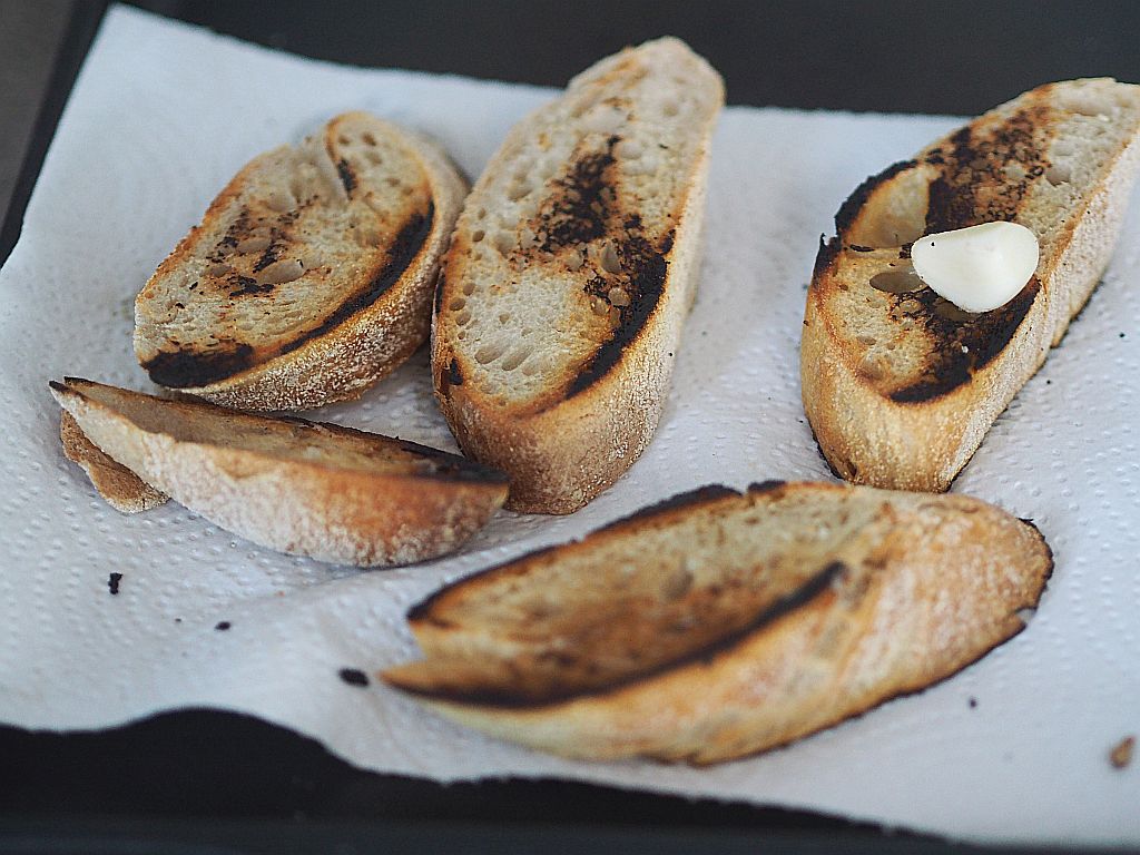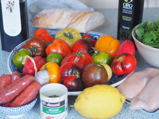 Erst die Tomatenvielfalt nach Lust und Laune in Stücke schneiden. Paradeisersaft Eine Marinade mit Olivenöl, Rotweinessig, getrocknetem Oregano, Salz und Pfeffer verrühren, auf die Paradeiser gießen, vorsichtig umrühren und bis zum Servieren ziehen lassen. Baguette in etwa 2 cm dicke Scheiben schräg schneiden und in der Pfanne beidseitig anrösten. In der Zwischenzeit die Hühnerbrust zwischen normalerweise Backpapier mit einer Pfanne so lange klopfen, bis es 1 cm dick wird. Die Chorizo in halbe Zentimeter dicke Scheiben schneiden. Brot aus der Pfanne nehmen und mit Knofl einreiben. Die Chorizo in die Pfanne legen. Die Hendlbrust dazu geben und auf beiden Seiten anbraten. Die Chorizo ist schneller fertiggebraten und wird daher, wenn sie fertig ist, auf der Hendlbrust warm gehalten. Anrichten Brot auf den Teller legen, mit Paradeiser belegen und mit dem Paradeisersaft ersäufen (oder nur beträufeln) nach Panzanella-Art und mit Rucola bestreuen. Die Hendlbrust auf den Teller und mit Chorizo belegen.