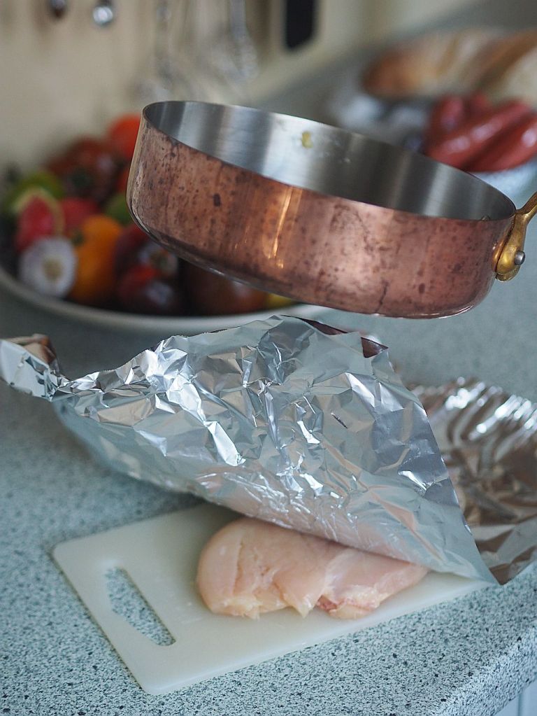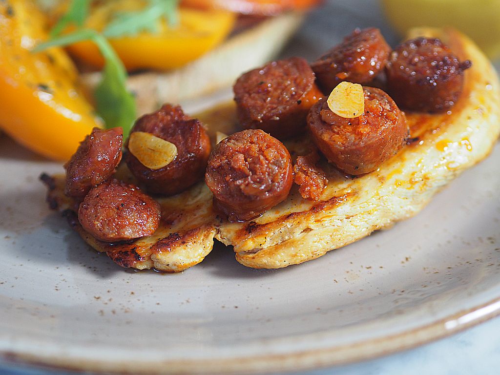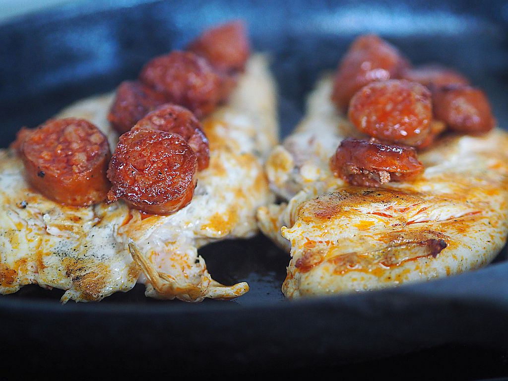 Ein Superschmäh vom Jamie, das Hendl mit der Chorizo zu belegen; sonst schmeckts ja nach nichts… Gut, normalerweise hätten wir das eingewienert und Debreziner oder was Ähnliches genommen, wir hatten aber die Gelegenheit, eine echte Chorizo aus Spanien zu erstehen, die ohne Konservierungsstoffe auskommt. Das Hendl kommt selbstverständlich aus der Steiermark, da gibt’s nix.