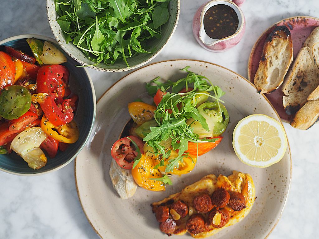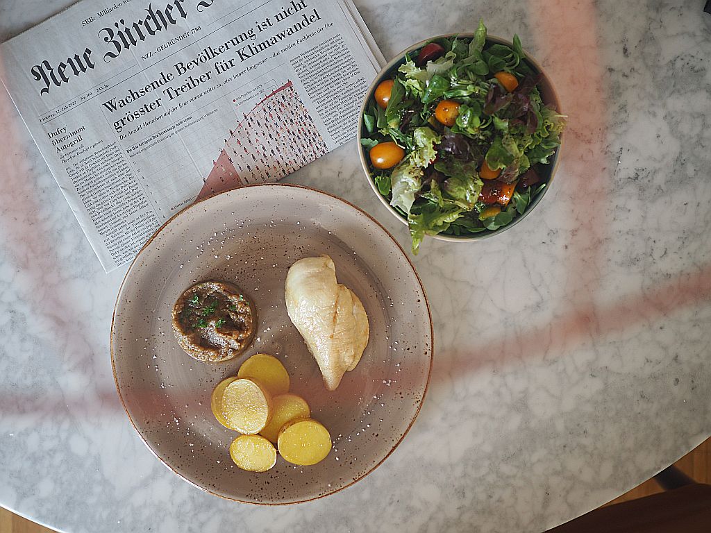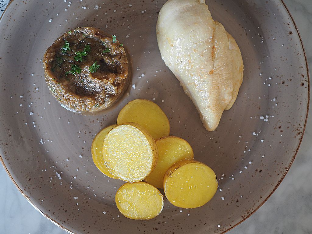 Zwei Melanzani 30 Minuten im Backrohr weichgaren, herausnehmen und die Haut abziehen. Klein würfeln, in eine Schüssel geben, verrühren. Dazu geben: eine halbe Zitrone und den Saft, etwas Salz, 1 TL Honig, 1 TL Harissapaste, 1 EL Olivenöl und 1 EL gehackte Petersilie. Alles zusammenrühren und ziehen lassen. Kartoffeln in Scheiben schneiden und mit der Hühnerbrust gemeinsam auf ein Backblech legen und mit wenig Olivenöl beträufeln. Bei 180 Grad fertiggaren. Inder Zwischenzeit Salz, Tomaten, Paprika schneiden und in einem Dressing aus Apfelessig, Olivenöl und Salz vermischen. Servieren.