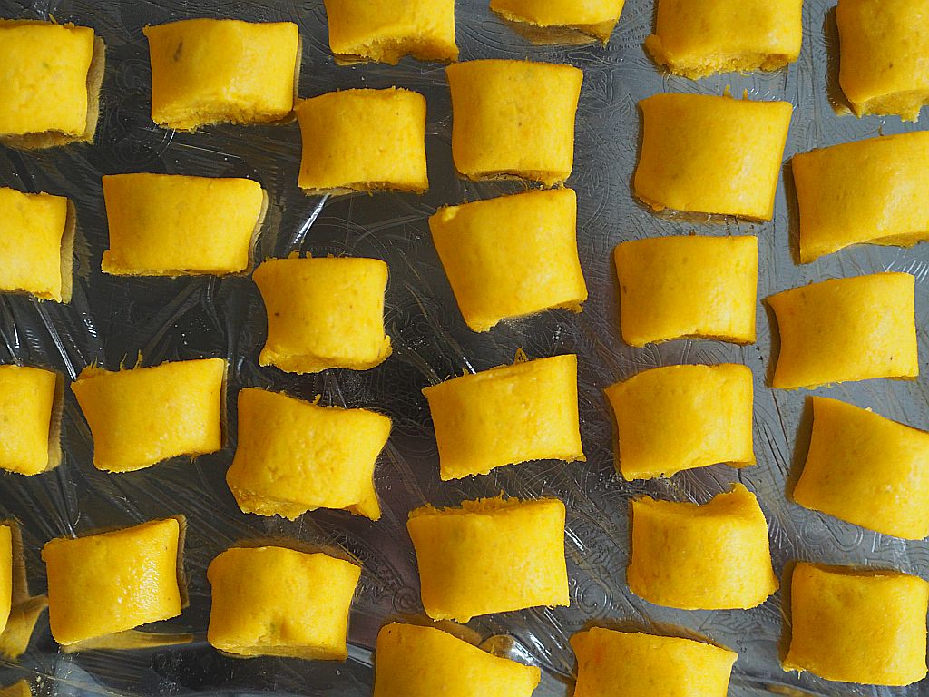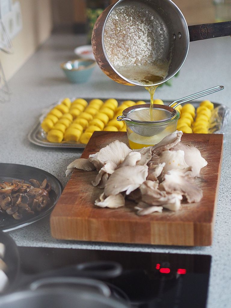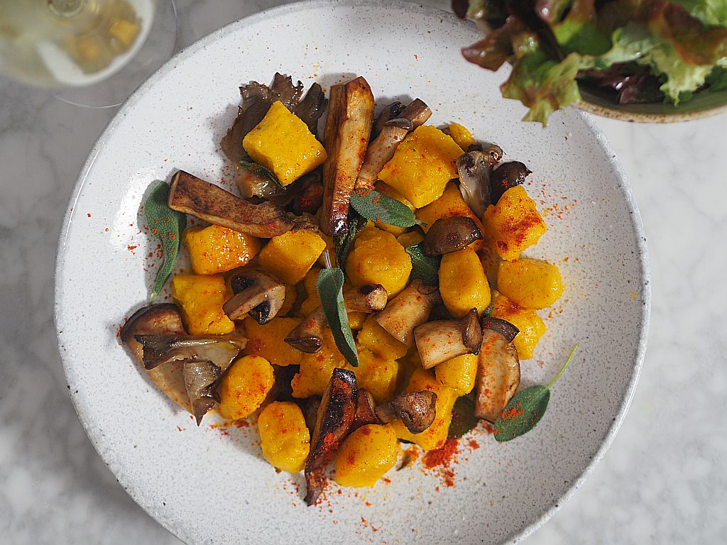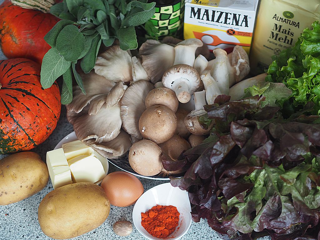 Nach Gartenküche, Dr. Oetker-Verlag, 2021, Kürbis-Gnocchi mit Pilzen und Salbeibutter, S. 120. Im Originalrezept werden die Kürbisgnocchi mit ein bißerl Mehl gemacht. Dafür wollten wir nicht gleich einen ganzen Kilo Mehl kaufen, was machen wir mit gar soviel Mehl? Ich weiß, ich weiß, mancheiner gibt sich das ins Ladl, wenn der Blackout kommt. Aber wenn kein Strom ist, kann man eh kein Brot backen, oder? Notabene haben wir Maisstärke und ein halbes Kilo Maismehl gekauft. Die Pilze kommen aus Österreich: Kräuter- und Kastanienseitlinge aus dem Burgenland. Und die braunen Champignons kommen aus dem Weinviertel. Hokkaidokürbis aus Baden bei Wien. Tomaten von Blün, einer Gruppe von Landwirten in Wien, Salate aus dem Tullnerfeld. Eier von den mobilen Hühnern aus dem Weinviertel. Wohlan, das ist gurkerl.at.