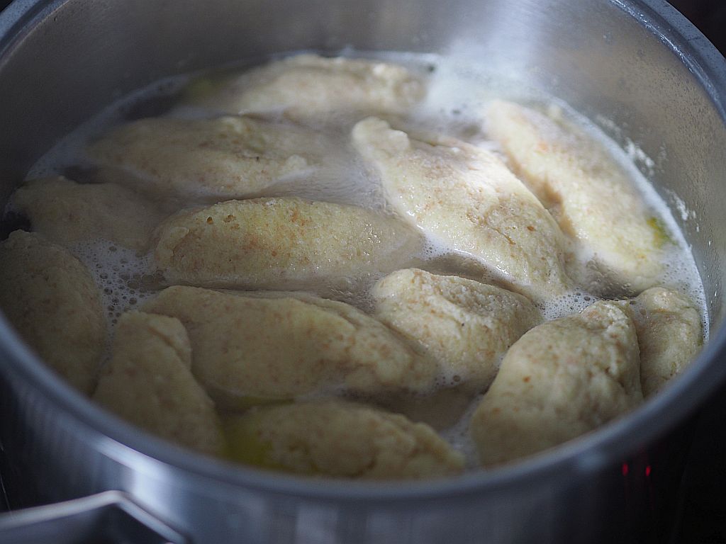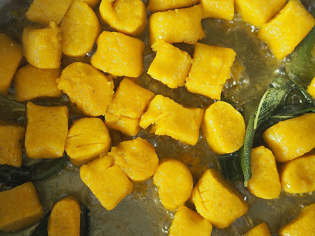 Kürbis-Gnocchi Zwei kleine Hokkaido-Kürbisse, beide haben etwa 700 g, in Scheiben schneiden, Gehäuse ausschaben, mit der Schale im Backrohr bei 180° etwa 30 Minuten weich garen. In der Zwischenzeit zwei große mehlige Erdäpfel, beide haben etwa 300 g, weich kochen. Und dann noch heiß halbieren, die halbe Erdäpfel durch die Kartoffelpresse drücken. Hokkaido-Kürbis, wenn er weich ist, ebenfalls durch die Kartoffelpresse drücken, die Schale entfernen. Einen Dotter, Salz, Muskatnuß dazu geben und durchrühren. Ein bissi auskühlen lassen. 50 g Maisstärke und 100 g Maismehl in den Teig einarbeiten. Portionsweise zu einer langen Wurst ausrollen und dann in zwei cm Abständen abschneiden. Braune Butter langsam köcheln, bis sich das Eiweiß bräunt und auf die Seite stellen. Pilze putzen und in der Pfanne mit Olivenöl anbraten und warmstellen. Die braune Butter in eine große Pfanne geben, 8 Salbeiblätter dazu und langsam erwärmen. Salzwasser aufkochen, die Gnocchi dazugeben und zwei Minuten durchziehen lassen, nicht rühren, den Topf nur rütteln, damit die Gnocchi nicht auseinandergehen. Gnocchi mit dem Abseihlöffel aus dem Wasser geben, gut abtropfen lassen und in die erwärmte Salbeibutter geben, vorsichtig durchschwenken. Die Pilze vorsichtig unterheben. Anrichten auf dem Teller mit süßem Paprikapulver bestreuen. Batavia- und Eichblattsalat mit Apfelessig und Walnußöl anmachen. Dazu ein Glas Grüner Veltliner. Nachspeise: Vanillepudding.