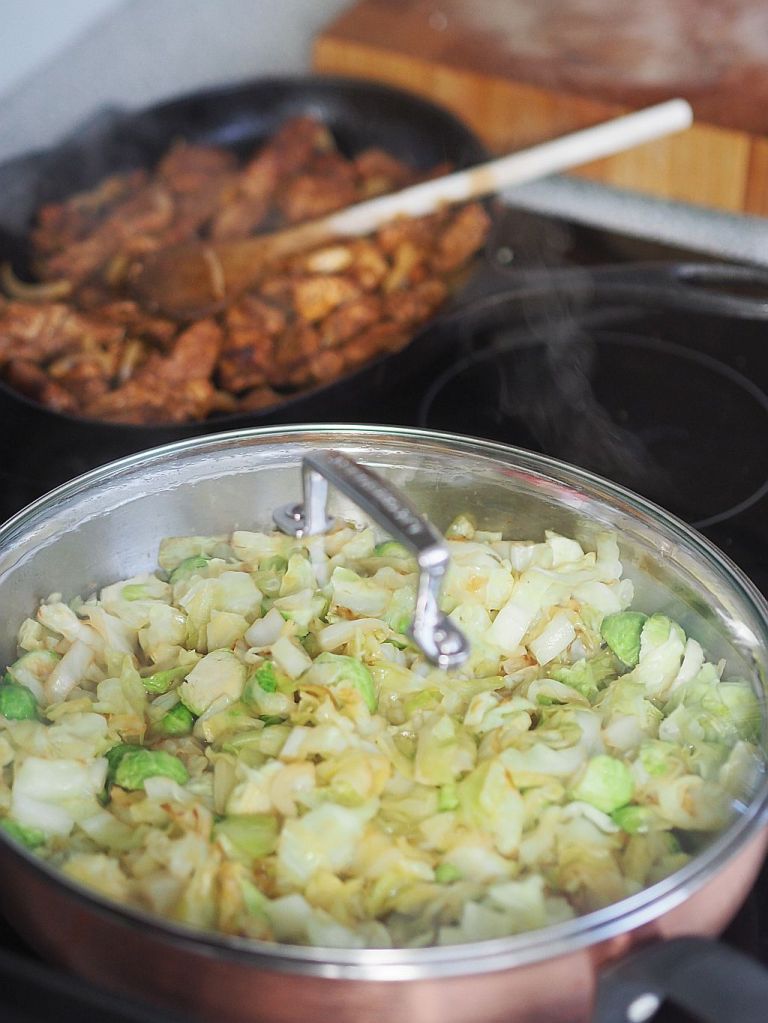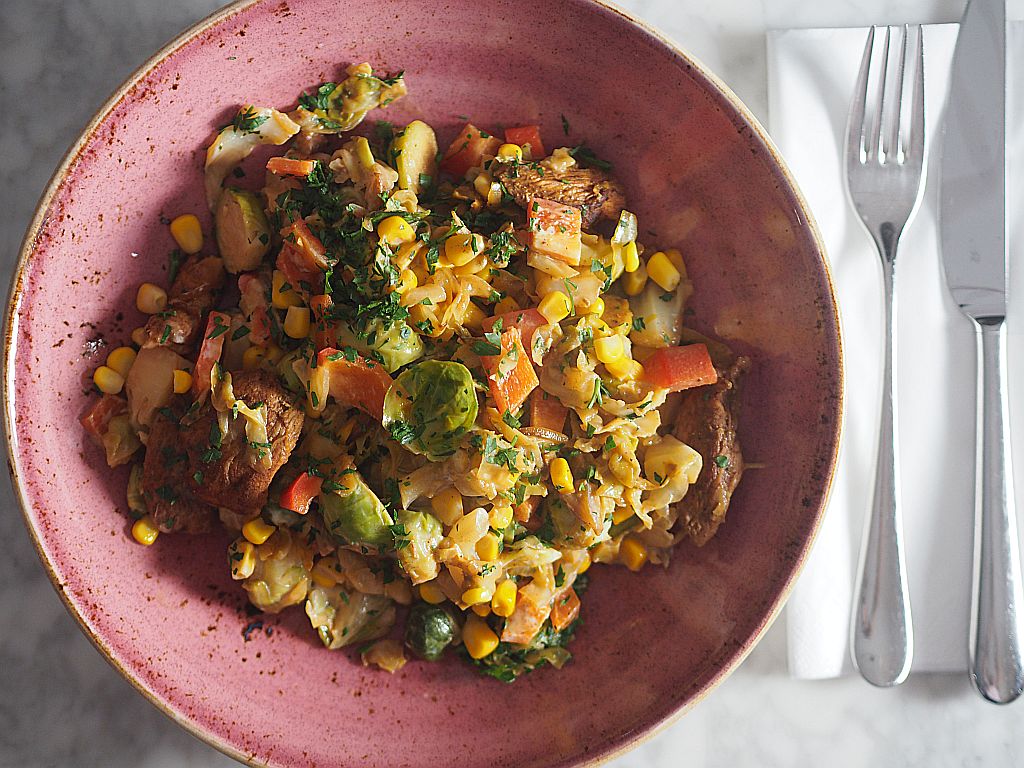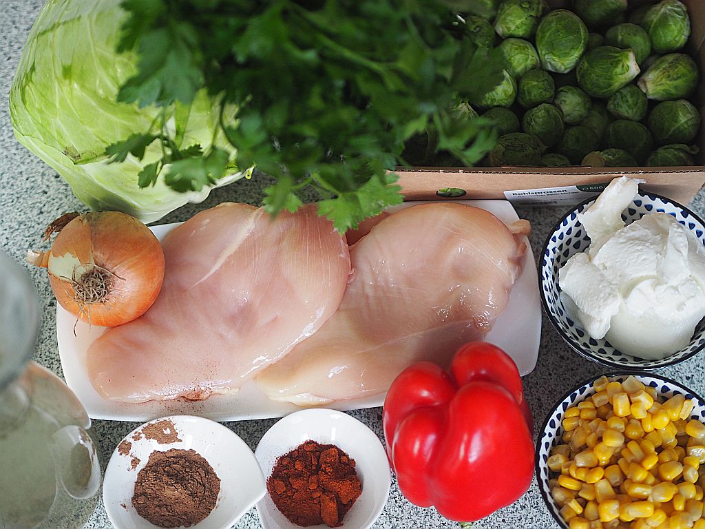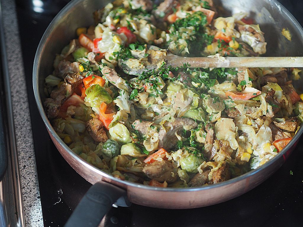 Spitzkraut in mundgerechte Stücke schneiden. Kohlsprossen putzen, halbieren. Olivenöl in der Pfanne erhitzen. Das Gemüse dazu geben und scharf anbraten. Mit Gemüsebrühe aufgießen und zugedeckt bißfest garen. In der Zwischenzeit die Hühnerbrust in längliche Stücke schneiden, mit scharfem, geräuchertem Paprikapulver, Piment, Salz und Olivenöl marineren. In der Pfanne anbraten. Eine Zwiebel schneiden, zum Fleisch geben und mitbraten. So. Dann das Fleisch zum Kohlgemüse geben. Maiskörner und Frischkäse dazu geben. Mitköcheln lassen. Kurz vor dem Servieren eine geschälte gewürfelte Paprika und fein gehackte Petersilie einrühren. Mahlzeit.