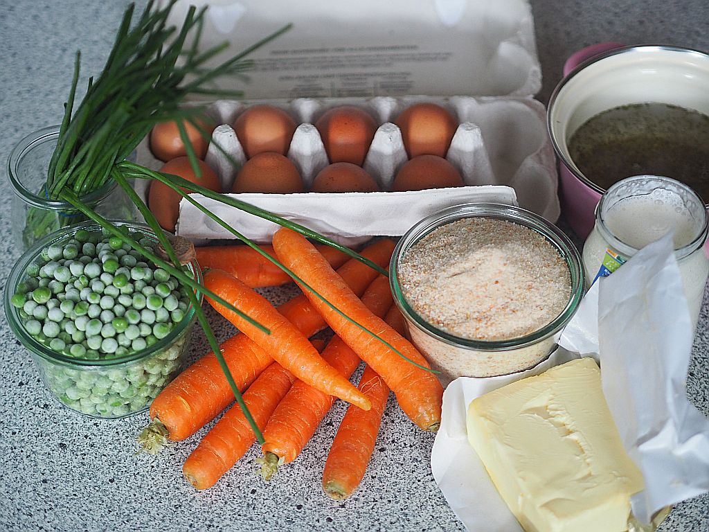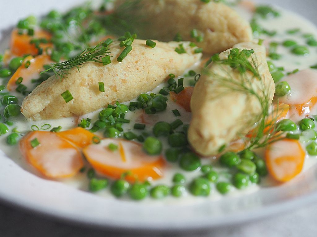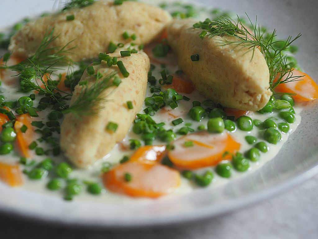 Nockerln 200 g weiche Irish Butter, einen TL Salz und eine gute Prise Muskatnuß schaumig rühren. 4 Dotter und 4 Eier so nach und nach in die Butter einarbeiten, darauf achten. Daß die Eier Zimmertemperatur haben. 160 g Semmelbrösel nach und nach dazugeben und gut verrühren. 2 h im Kühlschrank rasten lassen. In der Zwischenzeit das Gemüse zubereiten: ½ kg Karotten schälen und in 2 mm dicke Scheiben schräg einschneiden. 300 ml Gemüsesuppe aufkochen, die Karotten dazugeben, bißfest kochen, dann 200 g TK-Erbsen dazugeben, 3 – 4 EL Schlagobers einrühren und mit Maistärke binden. Wieder zu den Nockerln: in jede Hand einen Löffel nehmen, eine Portion aus dem Teig schöpfen und mit den Löffeln zu Nockerln formen. Salzwasser aufkochen. Die Nockerln hineingeben, das Wasser auf mittlere Hitze 8 -10 Min. ziehen lassen. Anrichten Mit Schnittlauch bestreuen.