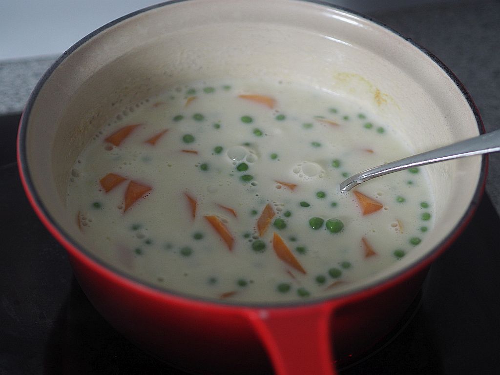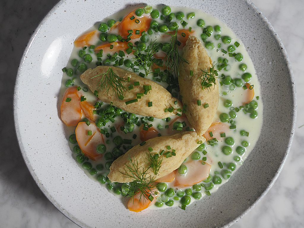 Es gibt Dinge, die schwer verzichtbar sind. Eines davon sind diese Nockerln mit Karotten und Erbsen.